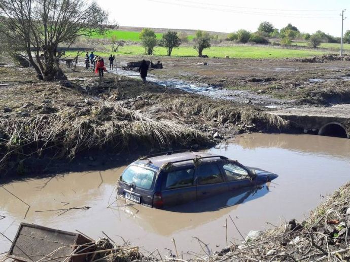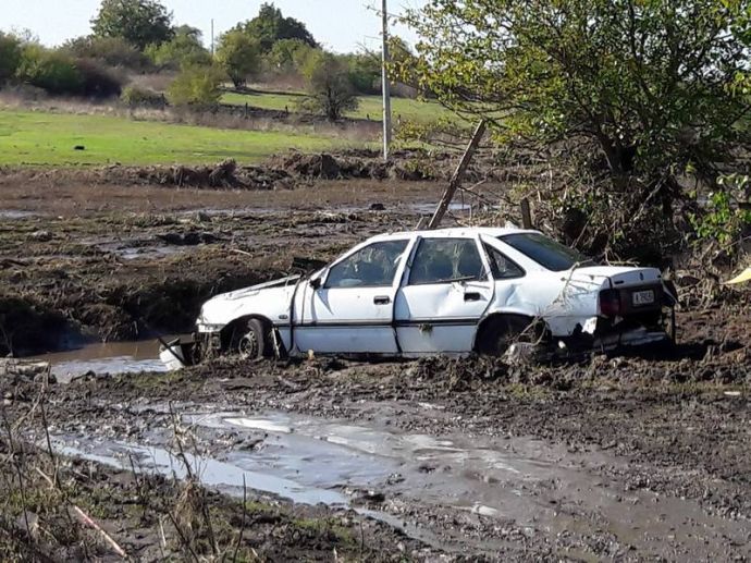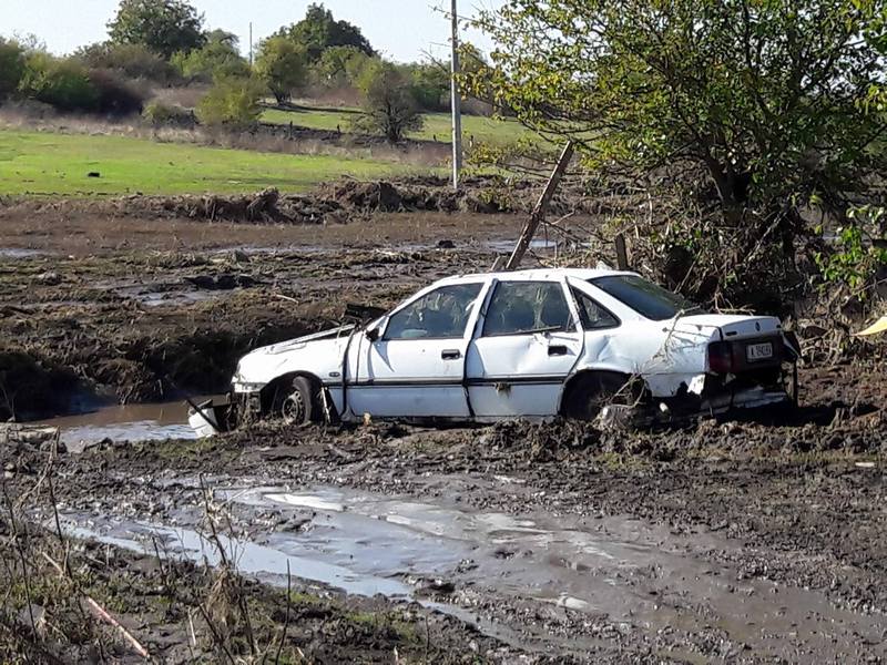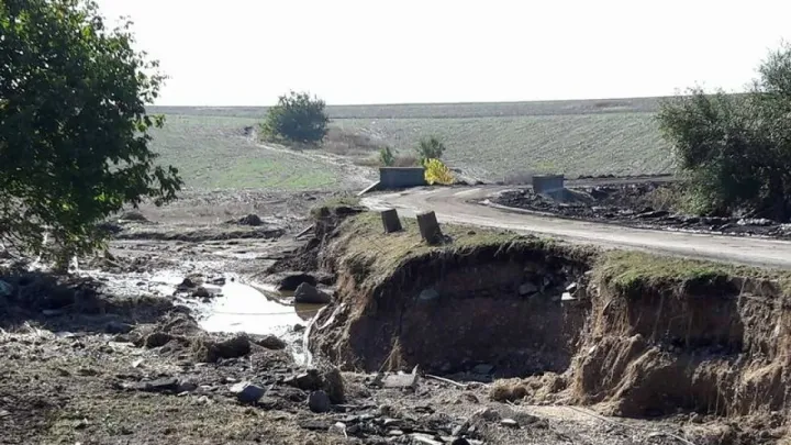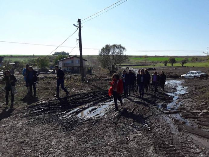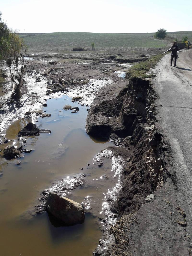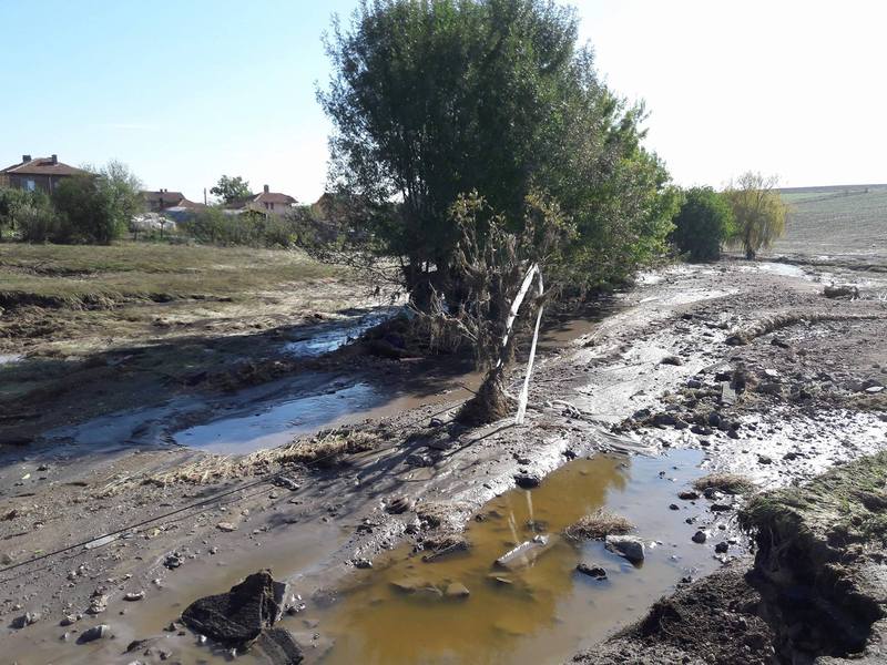 Асфалтовият път е буквално отхапан от водата. Гледката е страшна, макар че днес вече е слънчево, калта, тинята и щетите напомнят за бедствието от вчера.