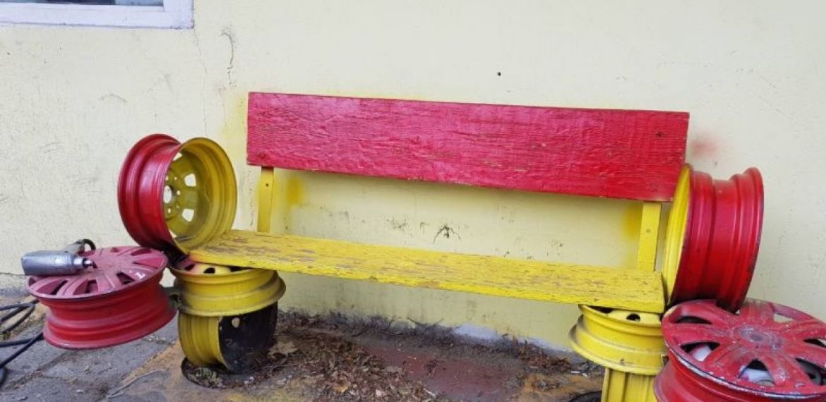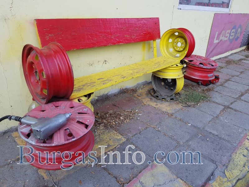 Да чакаш на опашка за смяна на зимните гуми често е досадно, но не и при този креативен гумаджия в бургаския ж.к. "Славейков", който за удобство на клиентите си е стъкмил пейка от автомобилни джанти и я е боядисал в слънчеви цветове. Освен крака за пейката, от джантите майсторът е направил и подлакътници, както и "масички" за вещи в двата края.