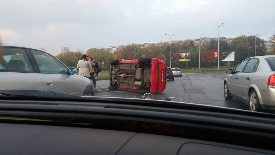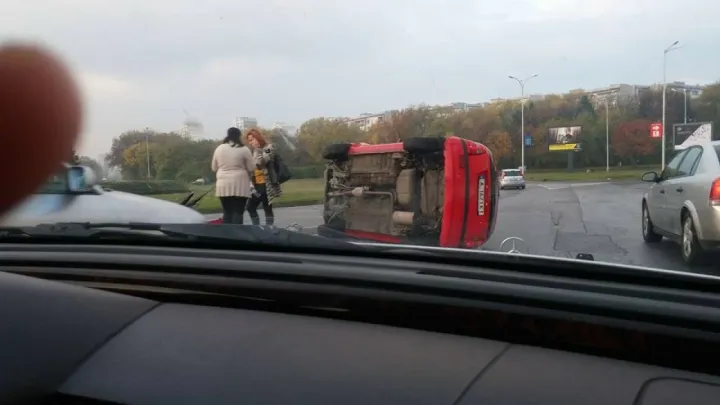 Обърнат червен автомобил на входа на Бургас от Сарафово блокира движението в пиковете часове тази сутрин. Автомобилът е обърнат точно на кръговото движение, до него стоят две жени, вече има и полиция, съобщават шофьори.