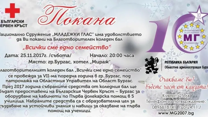 Национално Сдружение „МЛАДЕЖКИ ГЛАС“ организира на 25.11.2017г. /събота/ от 20:00 часа в гр.Бургас, хотел „Мираж“ за VII-ма поредна година Благотворителен коледен бал „Всички сме едно семейство“.