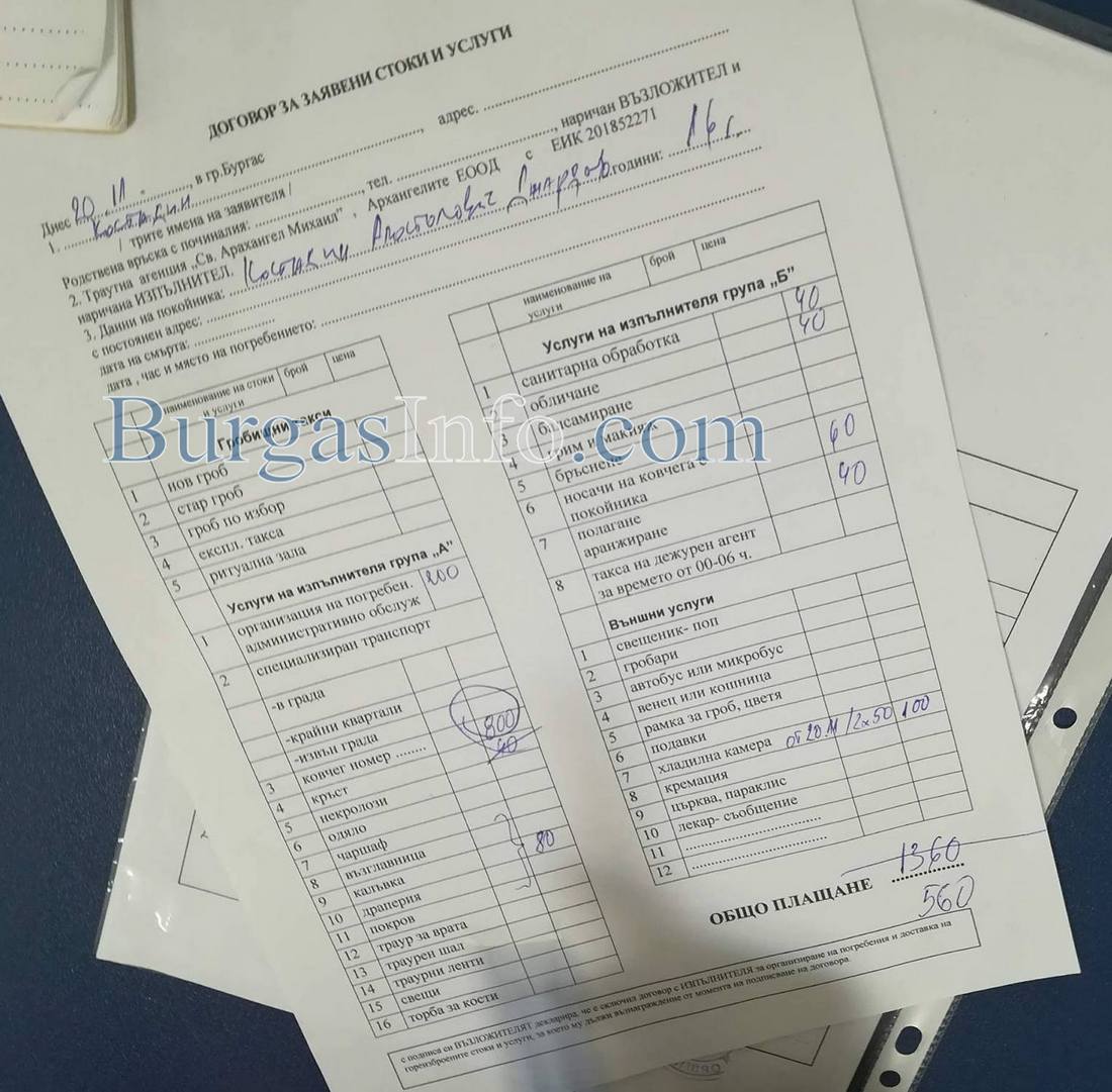Служител на агенция "Архангел Михаил", която стана причина за скандала, показа днес пред репортер на БургасИНФО, сметката, която била натрупана за три дни престой на тялото. Общата сума от 1360 лева беше поправена на 560. Впечатление прави, че горе няма изписано името на възложител, а само трите имена на Костадин Апостолов Джардов - 16 години. Така и не стана ясно как тялото на детето е попаднало в агенцията и какво се е случило в тези три дни, докато родителите на Костадин са съответно във Франция и в Беларус.