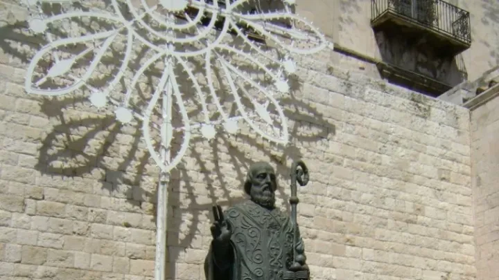 Св. Николай бил погребан в гр. Мира през 4 в., но няколко века по-късно градът е завзет от турци. Тогава един духовник от Бари получава съновидение, в което самият Св. Николай го моли да отиде и да пренесе мощите му от град Мира в град Бари. Духовникът организира няколко кораба, с които отива в Мира. След преговори с местни духовници, моряците вземат мощите и ги донасят в Бари. Там те са приети с всенародна радост и почести, а светецът става патрон на града. Веднага се започва строежът на катедралата "Св. Николай". В нейната крипта се полага саркофагът с мощите на светеца. Там пстоянно идват поклонници, които търсят чудеса и изцеление. Продават се малки стъкленички с миро.