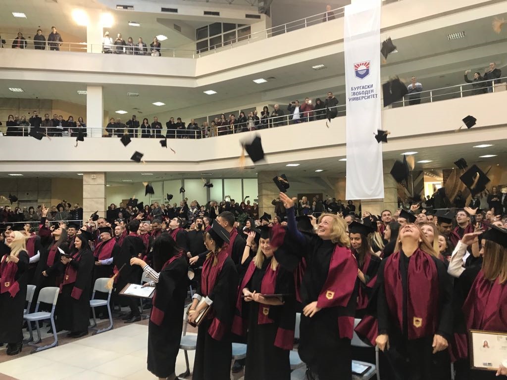 Сред гостите на церемонията бе кметът на Бургас Димитър Николов, който отправи своите лични благопожелания към завършващите висшето си образование: