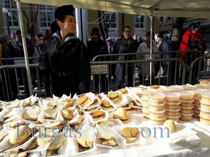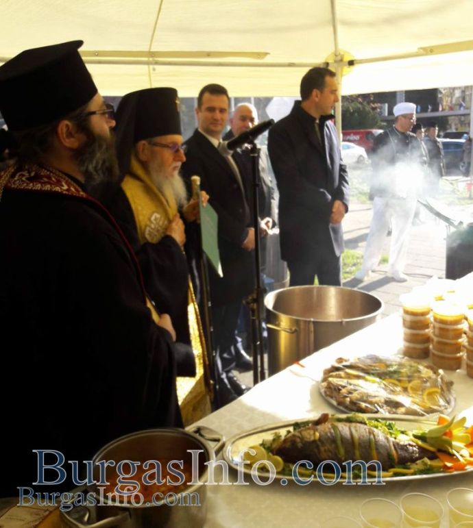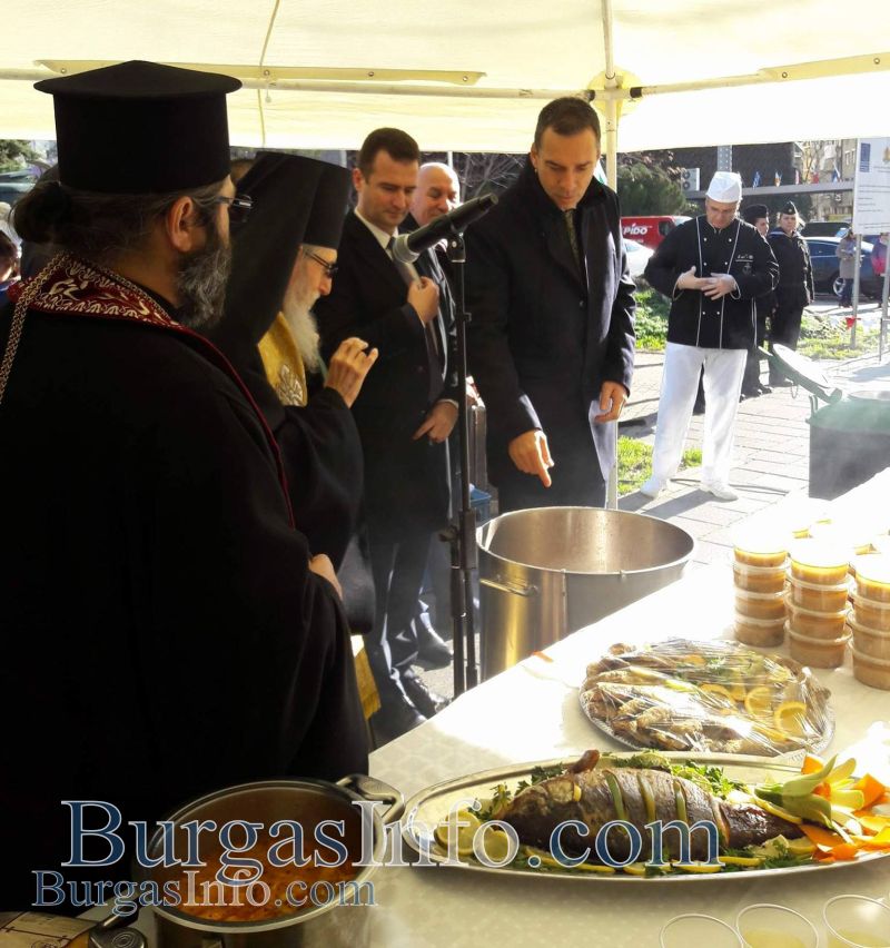 Веднага след приключването на обредният ритуал по разчупване на питката, започна раздаването на традиционния за празника рибен курбан, приготвен по стара рибарска рецепта и със съдействието на полевата кухня на Военноморска база-Бургас.
