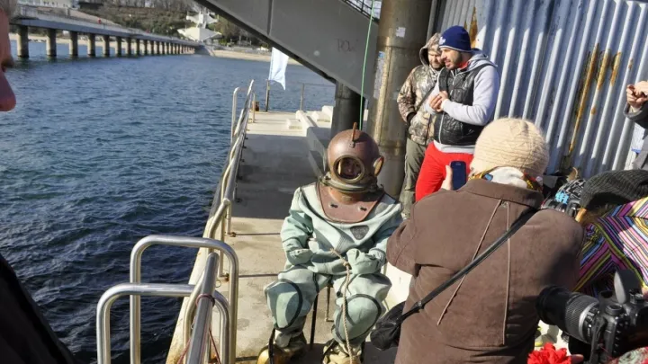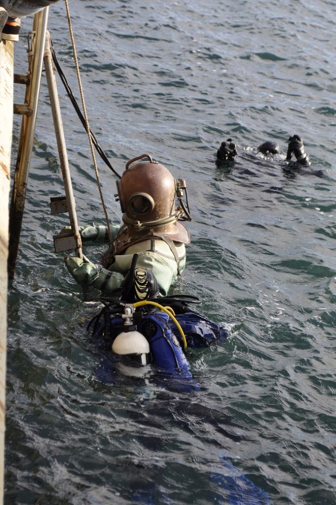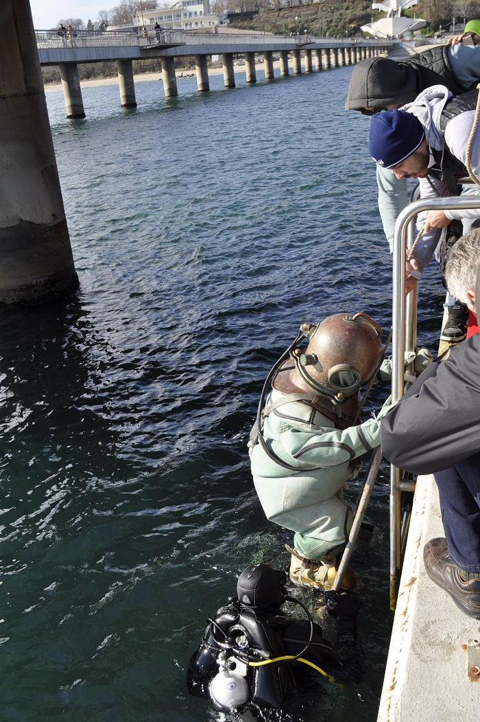 Бургаските водолази обогатиха празничната програма на Бургас като демонстрираха гмуркане със стар 90-килограмов от 60-те години на миналия век. Подводните приключения започнаха 11.30 часа на моста, а гмуркачите показаха пред бургазлии как се използва тежката подводничарска техника.