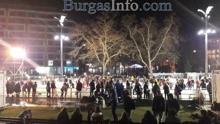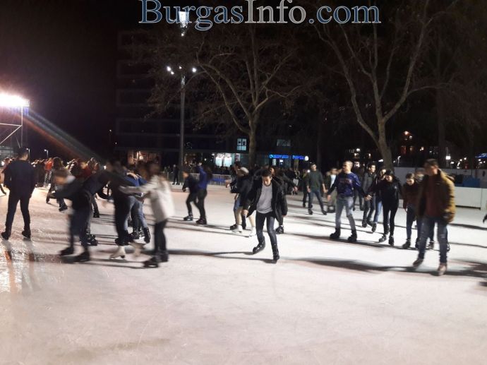 Десетки младежи се забавляват на ледената пързалка пред Съдебната палата в Бургас. Истински фурор става вечер, особено в почивните дни. Посетителите, които са предимно деца, се наслаждават на всяка минута, а при предупреждението, че до края на сесията остават 5 минути, започват да се пързалят с все сила.