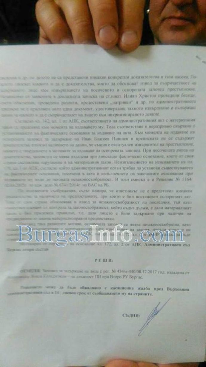 Решението на Административния съд от петък вечерта, с което беше освободен Иван Пишиев
