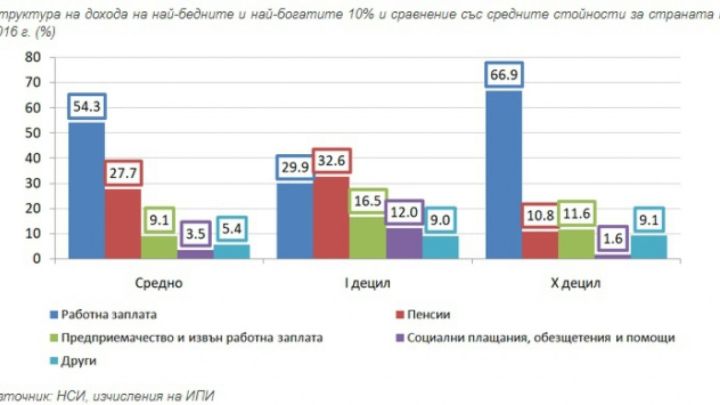 Всички тези отлики си имат логични обяснения и те се намират в приходната част на семейните бюджети. В групата на най-богатите почти 80% от доходите идват от заплати, предприемачество, хонорари и т.н. Хората, които са на другия полюс, разчитат най-вече на пенсии, социални добавки, помощи, обезщетения. Точно по тази причина бедните домакинства дават много малък процент от средствата си за данъци, а богатите пълнят хазната.