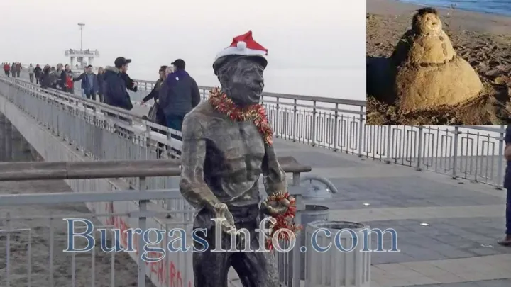 Липсата на сняг изобщо не попречи на Коледното настроение край морето днес. Въпреки, че няма сняг, местните жители проявиха изобретателност и използваха наличните ресурси – море и пясък за типично занимания по това време на годината. В Бургас днес беше 10 градуса и мнозина се стекоха на разходка в Морската градина. Там, на входа на Моста, ги очакваше с коледна премяна фигурата на бургаския зевзек и бохем Петьо Пандира. Той беше окичен с шапка на Дядо Коледа и шал от гирлянди.