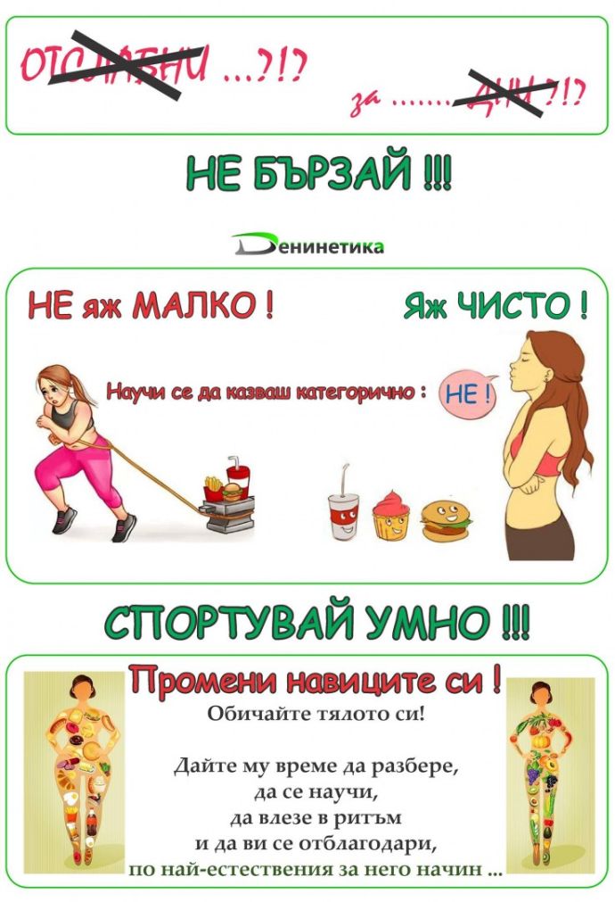 „Темата за храненето и спорта е обширна, и тук-там спорна, но има някои основни правила, към които ако се придържаме, но не само за период от време, а ги превърнем в навик, ще ни помогнат да постигнем и поддържаме желаното тяло. Първото и най-важно нещо, което всеки трябва да осъзнае е, че слабо тяло не означава нито по-здраво, нито по-красиво. Затова и не използвам думата отслабване. Това, което е нужно, и което правим е изчистване на излишъци, които с течение на времето, поради основни и масови грешки в храненето, сме натрупали в нас, затормозяват функциите на всичките ни органи, и ни придават неестетичен вид. Дали тялото се радва на промяната, която правим? О, да, повярвайте, доста е щастливо! Защото най-сетне сме решили да му помогнем да се върне и да тръгне отново в най-естествената за него посока. Няма шаблони и критерии. Има здраве, комфорт и личен избор. Стъпките са изключително лесно изпълними, и всичко опира само до едно – воля. Спортът казва „Do not hate the player, just change the game“ или перифразирано казано „Използвай един и същ ресурс – храната, но смени тактиката“, казва Деница. Ето най-важните съвети, които ни дава: