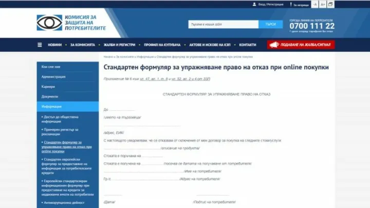 Комисията за защита на потребителите (КЗП) напомня, че от нейната интернет страницата може да бъде изтеглен формуляр за отказ от онлайн покупка. Той ще ги улесни, както при заявяването на желанието им да върнат несполучливи покупки, така и като доказателство, че са го направили, ако на по-късен етап възникне спор с търговеца по този въпрос.