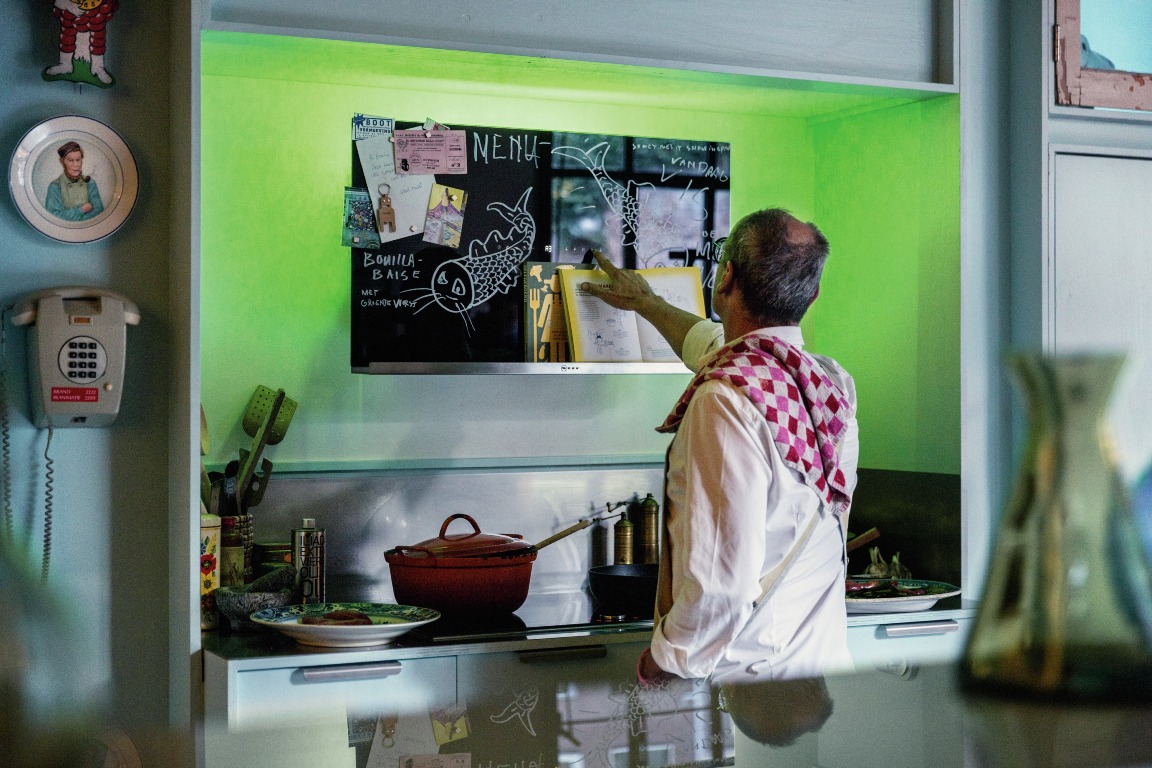 Естетическа наслада и комфорт дават индукционен плот с вграден аспиратор, стенния аспиратор Creative Slim с променящо цвета си интериорно осветление или комбинираният хладилник CoolCreative с врата от черно матово стъкло, на която се пише с тебешир.