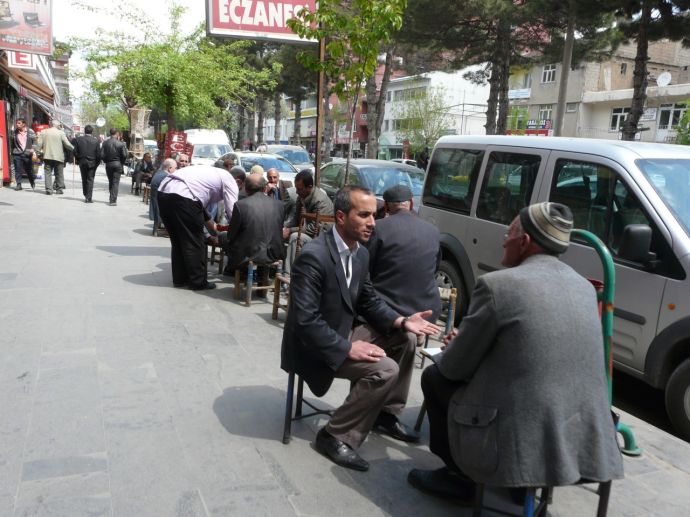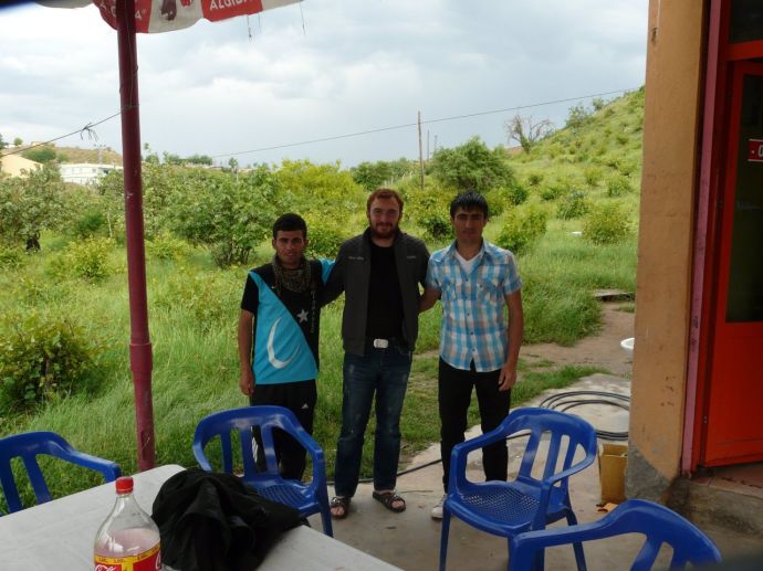 След Батман пак започна силно да вали и спрях на една крайпътна постройка, която после разбрах, че е джамия, но без минаре. Ходжата ме посрещна с кока-кола в ръка и седнахме двамата на една маса с тиквено семе и зачоплихме, защото не можехме да се разбираме много-много. Не след дълго заприиждаха някакви хора и сядаха на масата. Заприказвахме се, колкото ръцете ни позволяваха. Разбраха, че пътувам за Иран и се учудваха. Питаха ме за религията, отговорих християнин и се започна. Говорихме си за Иса (Исус), за Мохамед. Ходжата ми обясни, че е хаджия (ходил в Мека) и аз му казах, че съм хаджия, че съм ходил с мотора до Йерусалим. Семките свършиха, сложиха още две шепи, разговора продълже за политика, Ердоган, Обама, Путин, дъждът си валеше и изведнъж всички станаха, обърнаха се към надписа на стената и започнаха да се молят. Беше ми неудобно да ги прекъсвам и си останах на масата безмълвен. Бяха големи симпатяги, имаха профили във Фейсбук, разменихме ги. По едно време дойдоха жандармите с две емтелбета и джип, всички излязоха и се разцелуваха. И аз излязох, попитах дали мога да снимам, след кратък разговор с ходжата се съгласиха.