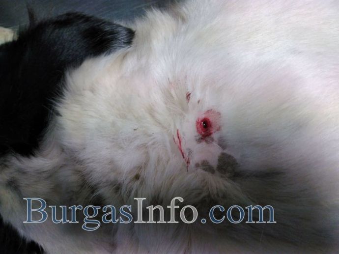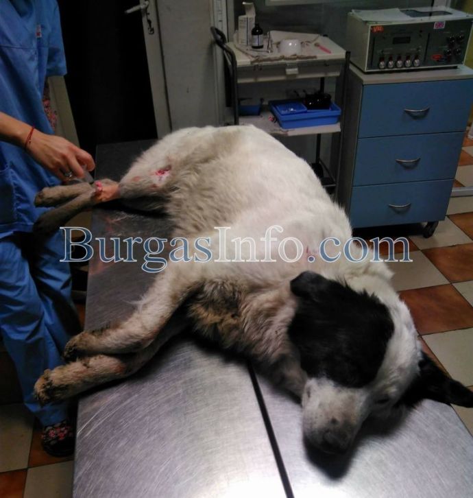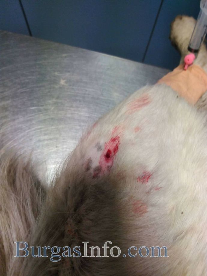 "Днес следобед, наш доброволец попадна на следствен оглед на простреляно куче, в района на кв. Банево. След приключване на огледа, той заведе животното в клиника Анимо, където в момента полагат грижи да я опазят жива. Момичето има четири входни рани по задните крака и една във врата, от близко разстояние. На мястото бе намерена и една гилза, която можете да видите и на снимката. Сачмата от входната рана на врата е заседнала в мозъчния канал на гръбначния стълб (чакаме да ни изпратят рентгеновите снимки) и прогнозата не е добра. Куча е все още в шок, обездвижена и по-подробни изследвания ще бъдат направени утре. Ако е все още жива... В момента е на системи, обезболяващи и каквото е необходимо в подобни ситуации, като незабавна грижа", съобщават от фондацията.
