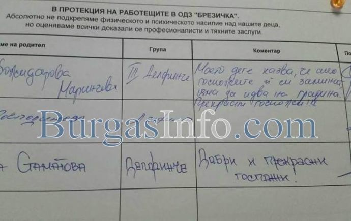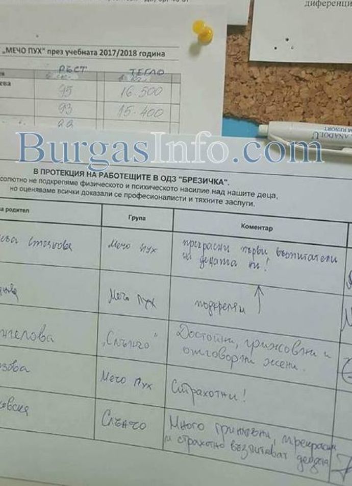 Тече и подписка, в която родители от останалите групи, сред които „Мечо Пух“, „Златна рибка“, „Слънчо“ са написали прекрасни отзиви за учителите на малките възпитаници. Тя е озаглавена „В протекция на работещите в ОДЗ „Брезичка“. Абсолютно не подкрепяме физическото и психическо насилие над нашите деца, но оценяваме всички доказали се професионалисти и техните заслуги“.