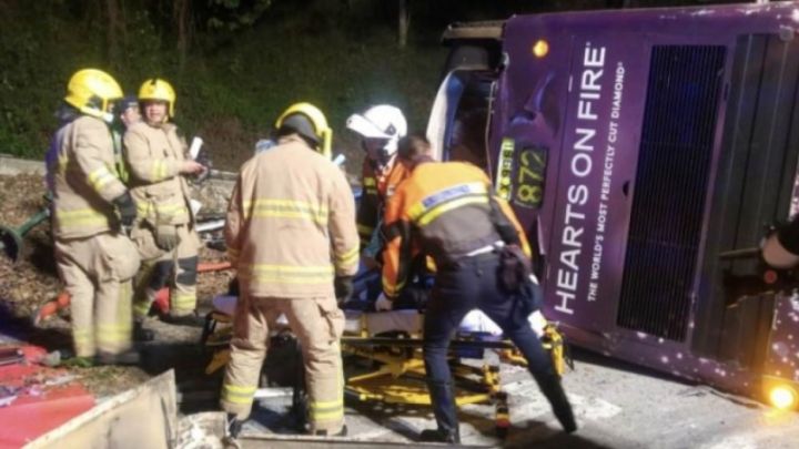 Местни медии публикуваха снимки, на които се вижда преобърнатият на една страна автобус до град Тай По.