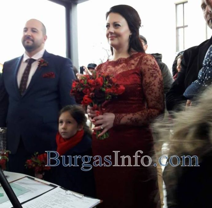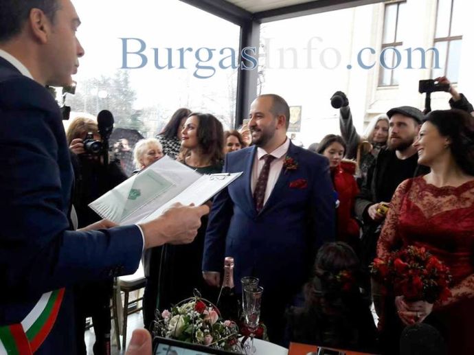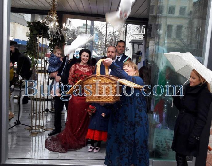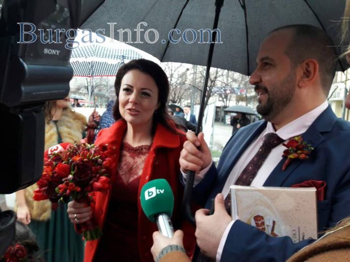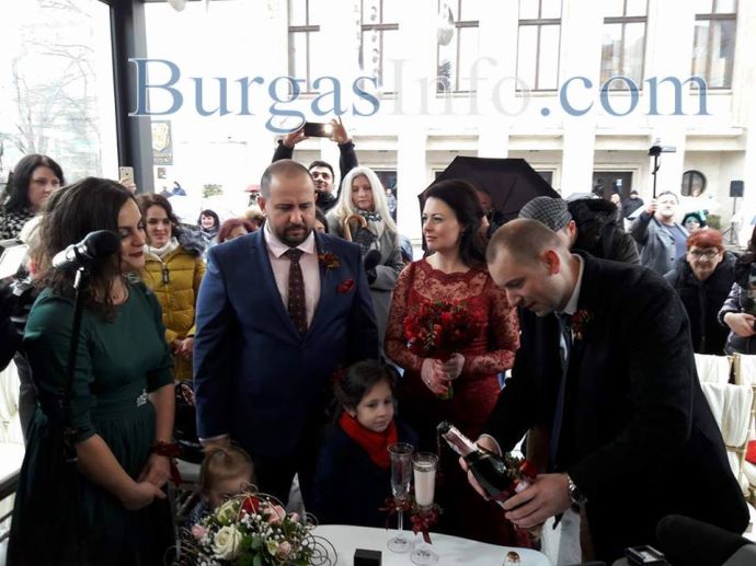 Мариана и Георги са втората двойка, която каза смело „Да“ на открито в центъра на Бургас днес, на Свети Валентин. Те избраха сватба в червено. Булката беше с червена рокля, малката дъщеричка на двамата младожеци носеше червен букет, дори шампанското беше червено.