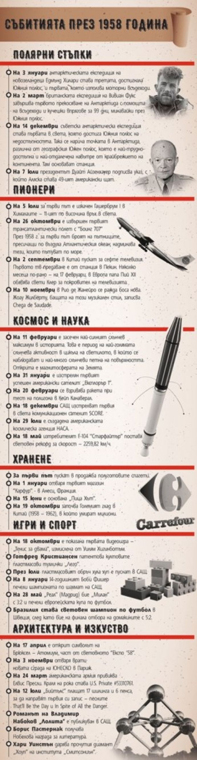 Много други събития на 1958 г. са свързани с обединение. На 1 февруари Египет и Сирия се сливат в Обединена Арабска република. Гамал Абдел Насър става първият ѝ президент. На 14 февруари хашемитските кралства Ирак и Йордания се обединяват в Арабска федерация, начело на която застава иракският крал Файсал II. На 27 януари във Вашингтон е подписано съветско-американско културно-образователно споразумение, известно като съглашението “Лейси-Зарубин”.