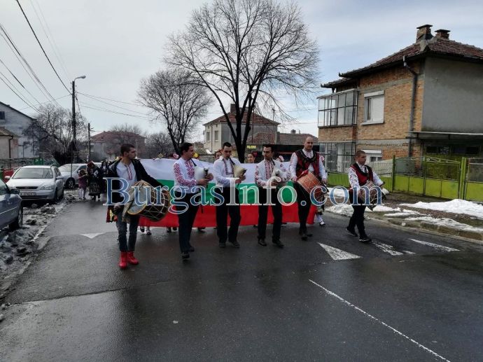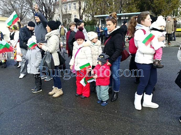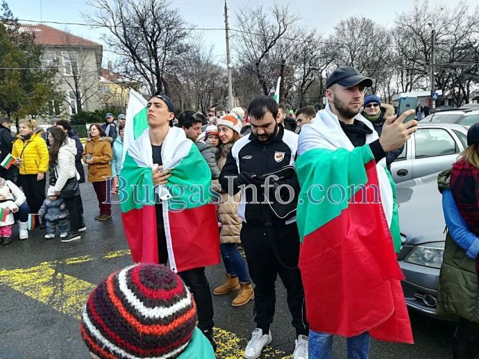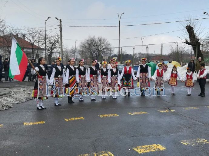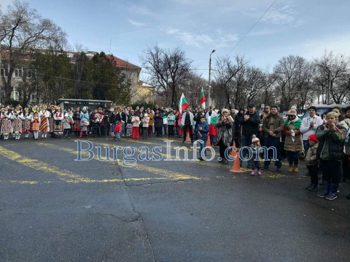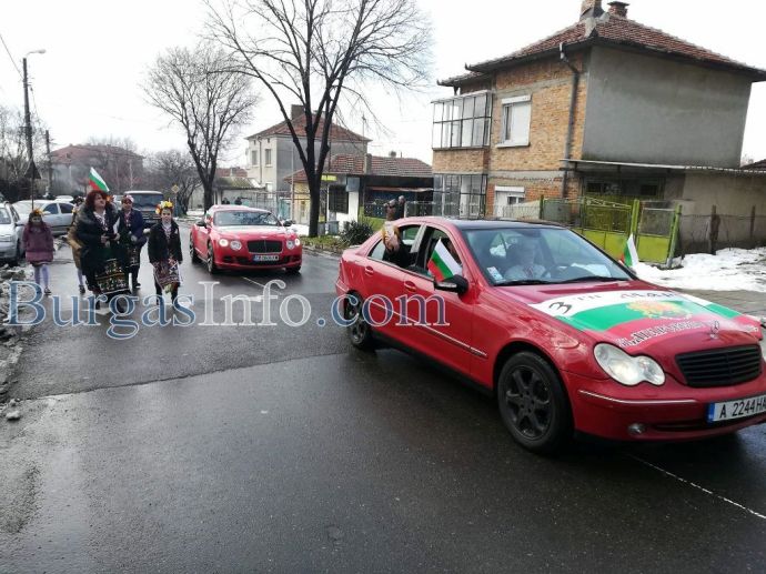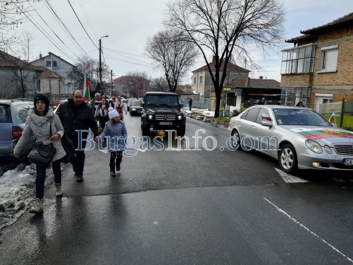 Внушителното автошествие, което тръгна от Бургас, буквално заля с трибагреника град Българово навръх националния празник 3-ти март. Колоната от коли беше предшествана от танцов ансамбъл.