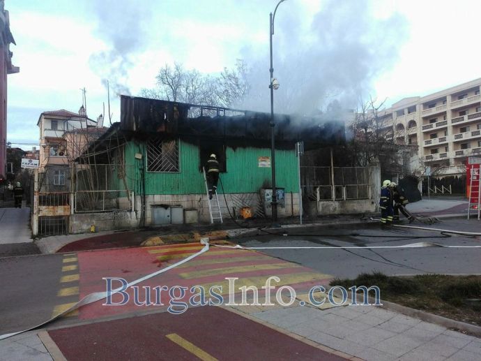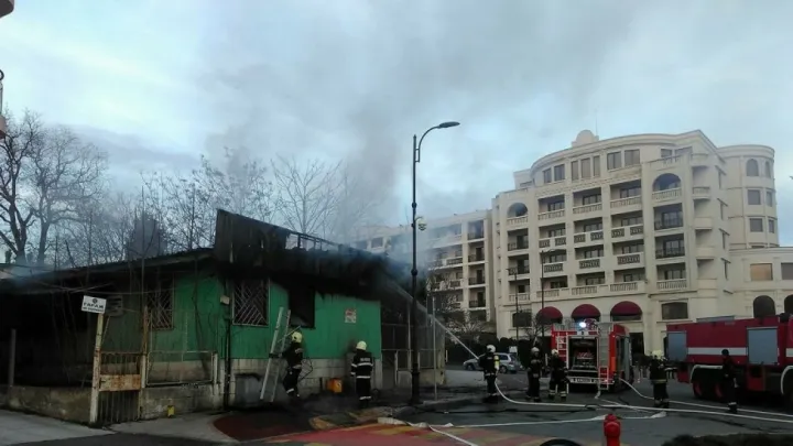 Две пожарни гасят изоставена дървена постройка точно срещу хотел „Приморец” в Бургас.