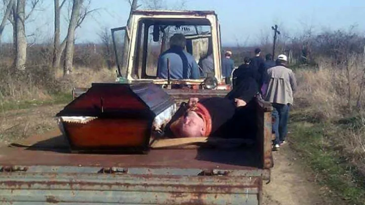 Под жаркото слънце опечалените близки го качили на катафалката, която представлявала ремарке на трактор, но отчето веднага полегнал до ковчега с покойника и захъркал, информира македонската електронна агенция Инфамякс. Погребението приключило без опело, а поп Ненад се събудил обратно в селото, където го върнал трактора.