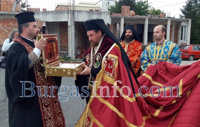 Преди минути мощите бяха посрещнати пред храма от викарния епископ Иеротей на Сливенския митрополит и бургаското свещенство.