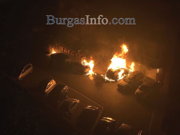Около 23.30 ч. снощи в Пето Районно управление – Бургас е получено съобщение за горящ лек автомобил “Фолксваген Туарег”, с бургаска регистрация, паркиран зад бл. 160, ползван от 46- годишен бургазлия. Огънят е потушен от два противопожарни автомобила и шестима огнеборци. Aвтомобилът е бил залят с туба с петролен продукт, която е била оставена на покрива на “Фолксвагена”. Пламъците обхванал и и намиращите се в съседство автомобили: "Сеат", със софийска регистрация, "Ситроен", с бургаска регистрация, "Опел", със сливенска регистрация и "Пежо", с бургаска регистрация.