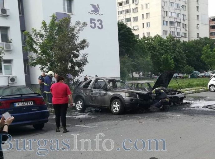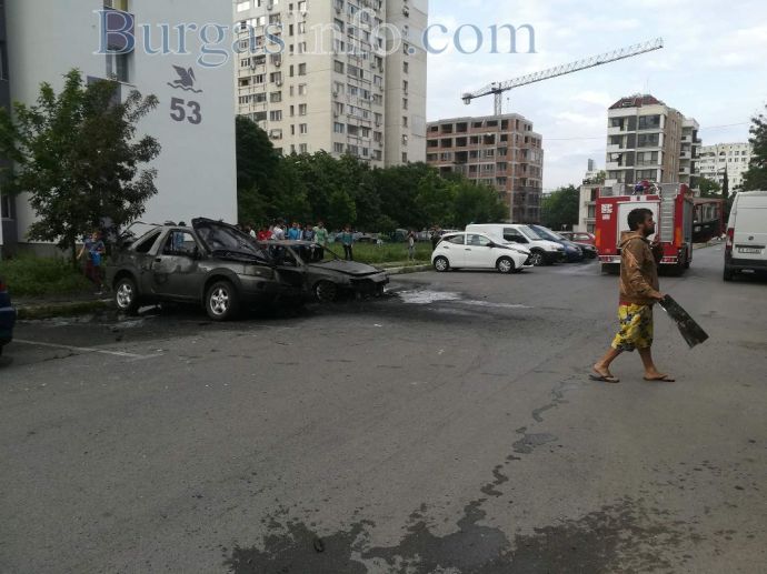 „Не сме правили ремонт на автомобила, нищо му нямаше. Пътувахме от ж.к. „Меден рудник” до „Славейков” и паркирахме тук. Когато излязохме от колата, тя започна да пуши. Вдигнахме капака, за да се помъчим да гасим, но не успяхме. Тя пламна бързо”, казаха пред БургасИНФО собствениците на леката кола „Деу Есперо”, която пламна на паркинга встрани от бл. 53 в ж.к. „Славейков” и превърна в руина съседния джип "Ровър".![]()