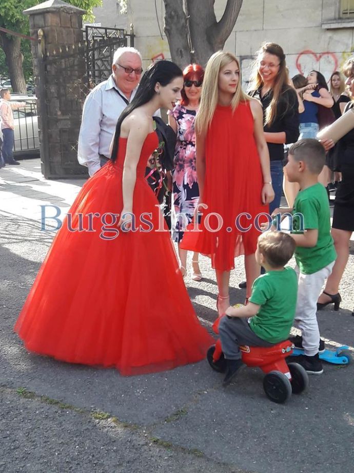 Младите дами от ГРЕ „Г.С. Раковски“ в Бургас предпочетоха официалните дълги рокли със загадъчно открити рамене и гърбове. Абитуриентките избраха стилните кокове, леки къдрици, умерения грим. Много настроение и усмивки изпълниха двора на гимназията, където в момента се събират възпитаниците й от випуск 2018.