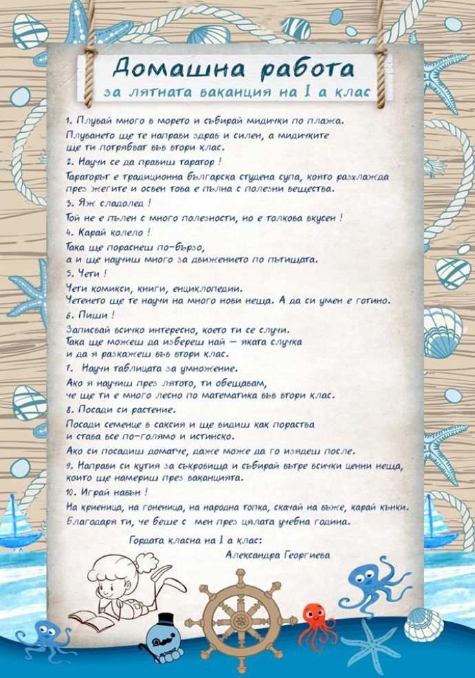 Бургаска учителка спечели сърцата на своите ученици, завършващи първи клас, както и на техните родители, с домашната работа, която даде на децата за лятото. Учителката е Александра Георгиева от бургаското ОУ „П. К. Яворов“. От училището потвърдиха, че се радват на подхода на преподавателката, която събра положителните коментари на майките и татковците в Бургас.