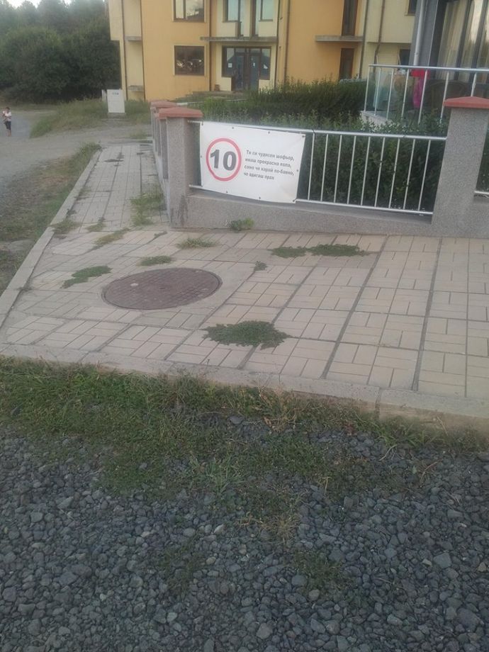 Собственици на имоти в новия квартал в Ахтопол сложиха табела с ограничение за шофьорите 10 км/час. Макар надписът да не е същински знак, който да трябва задължително да се спазва от водачите, той привлича вниманието. “Ти си чудесен шофьор, имаш прекрасна кола, само че карай по-бавно, защото вдигаш прах“, пише на табелата, закачена за оградата на един от имотите.