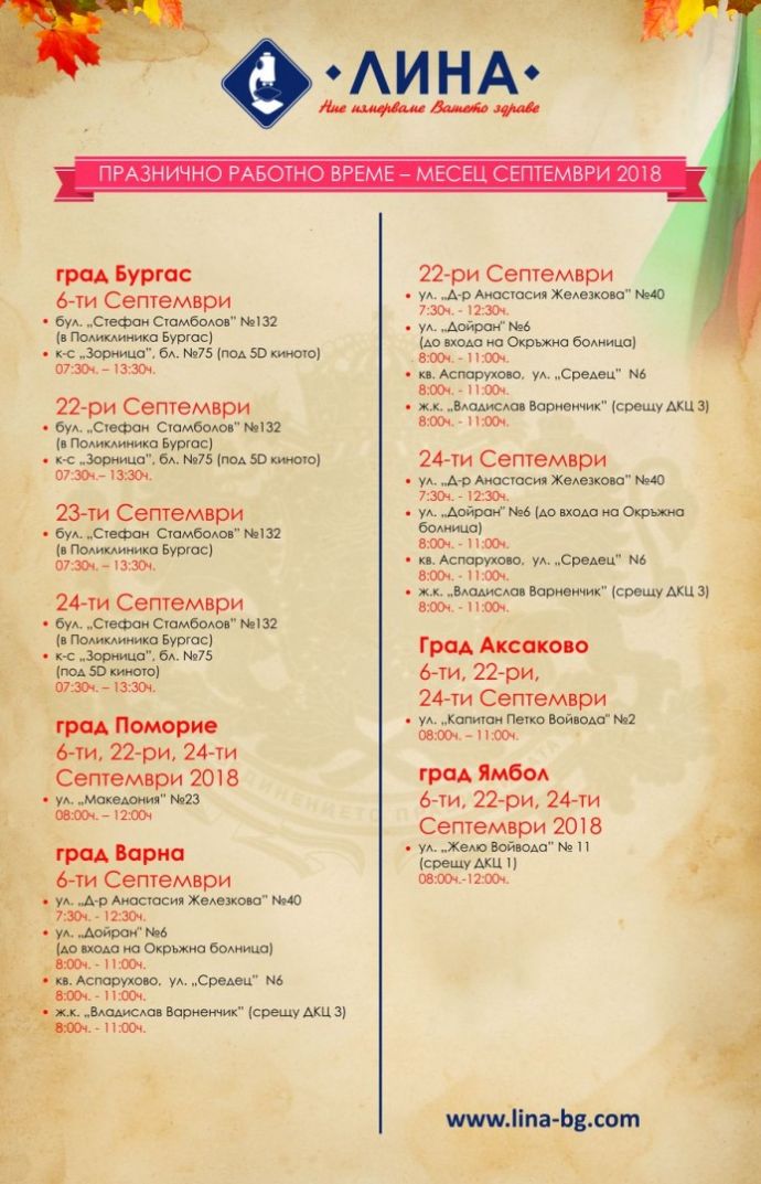 За удобство на жителите от областите Бургас, Варна и Ямбол, медицинска лаборатория „ЛИНА” ще осигури дежурни филиали по време на националните празници през месец септември.