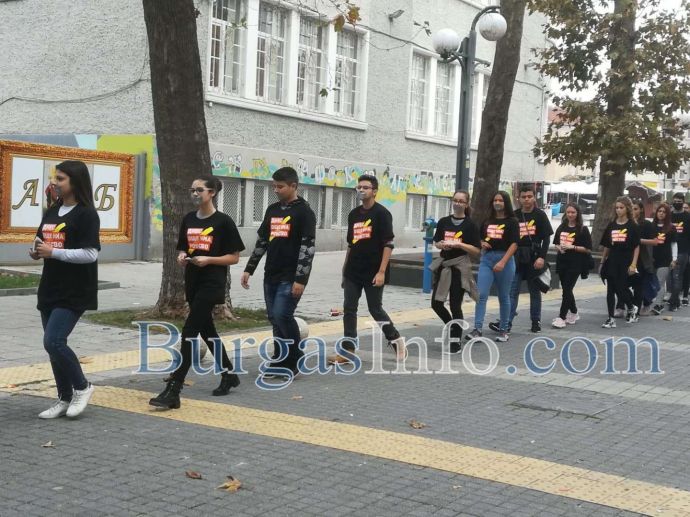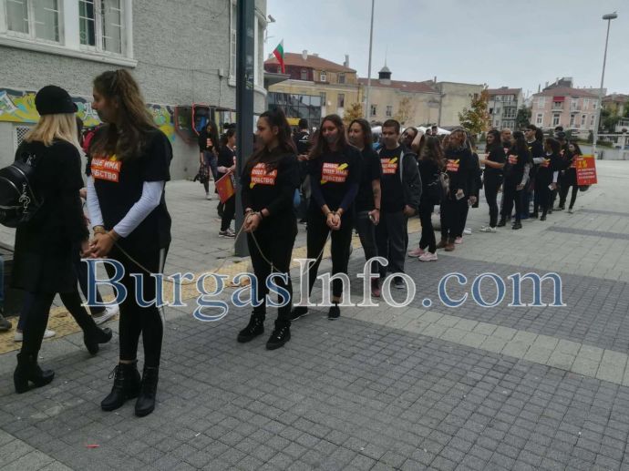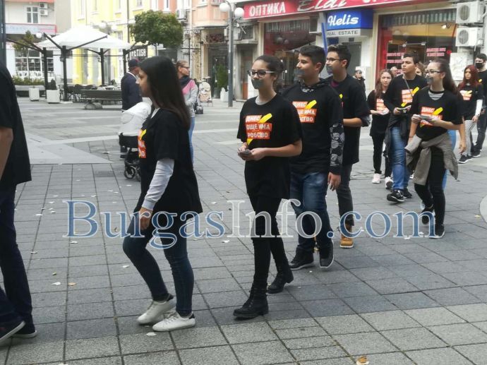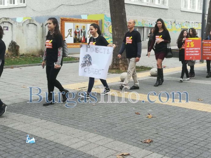 Десетки млади хора, облечени в черни тениски, преминават в този момент в колона по един през центъра на Бургас. те се събраха на площад "Кирил и Методий", откъдето започна походът им към свободата. В челото на колоната три от момичетата са вързани с въже, наподобяващо вериги на роби. С това те искат да кажат, че робството и днес съществува като сексуална експлоатация на момичета, затова е важно всеки млад човек да извърви правилните крачки към своя избор.