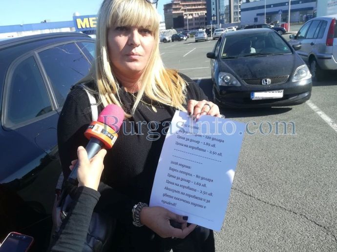 "Тук сме, защото само за месец масовият бензин А95 поскъпна с 11 стотинки, а дизелът с 13. В Бургас цените на горивата са едни от най-високите в страната, въпреки че тук се намира "Лукойл". Ние сме срещу неговия монопол", каза Росенка Бъчварова, която е модератор в една от най-големите бургаски групи в социалната мрежа "Шофьори Бургас".