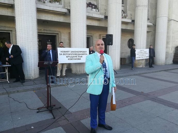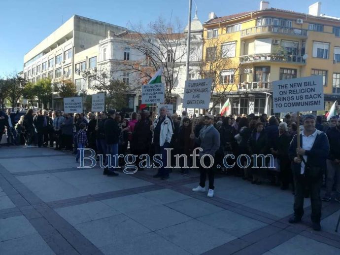Представители на протестантските църкви в Бургас излязоха на мирен протест срещу новия Зоконопроект за вероизповеданията. Според тях той погазва човешките им права.