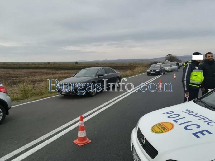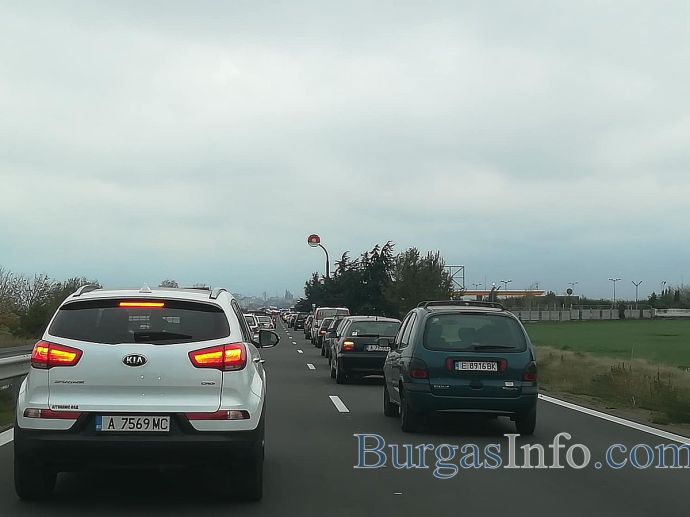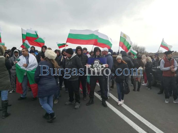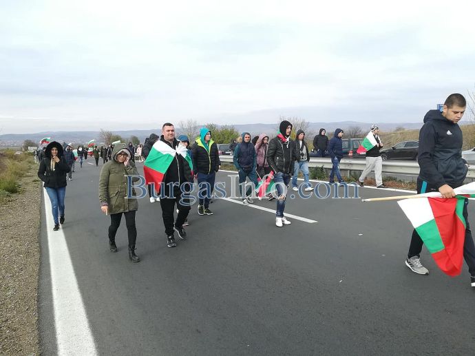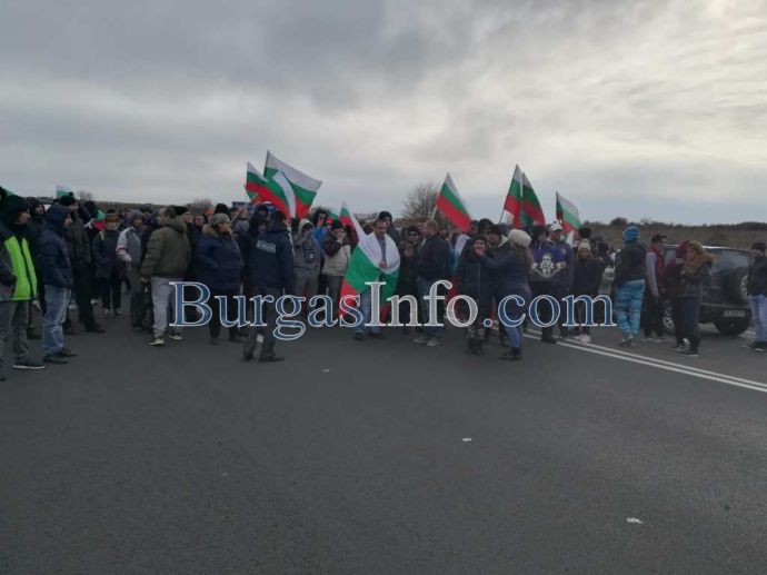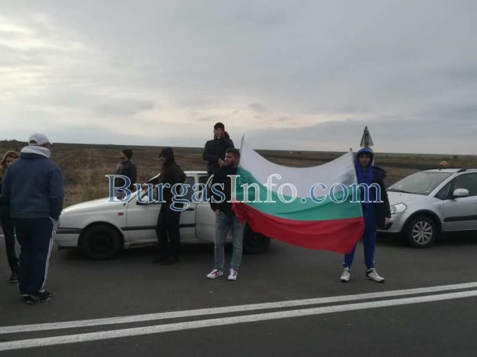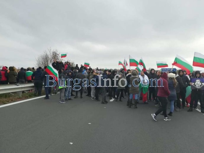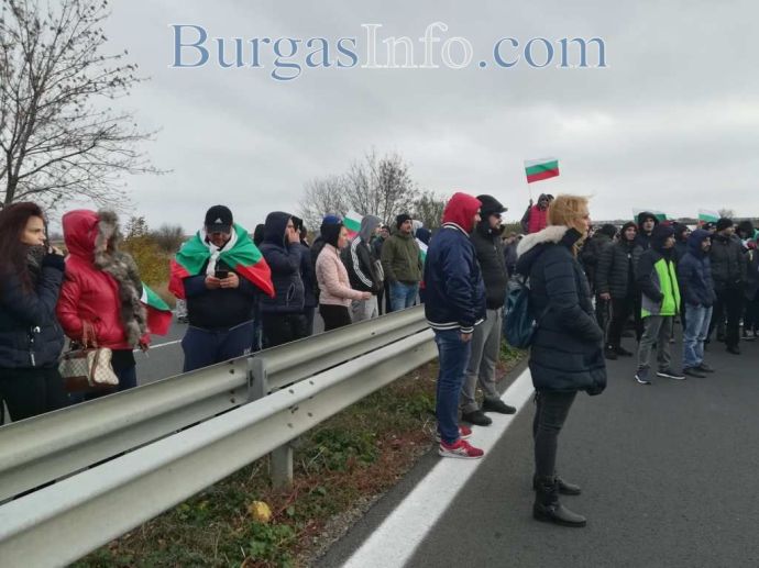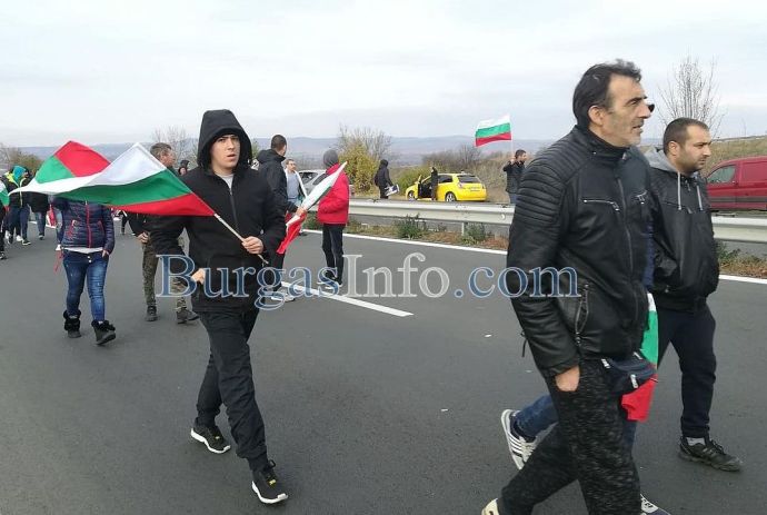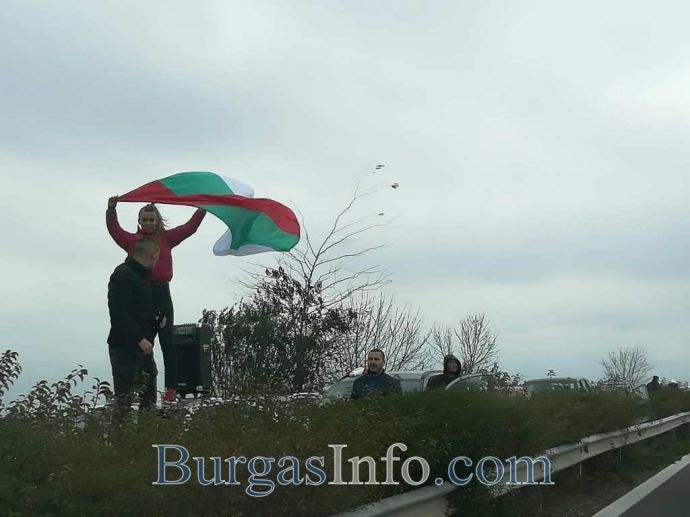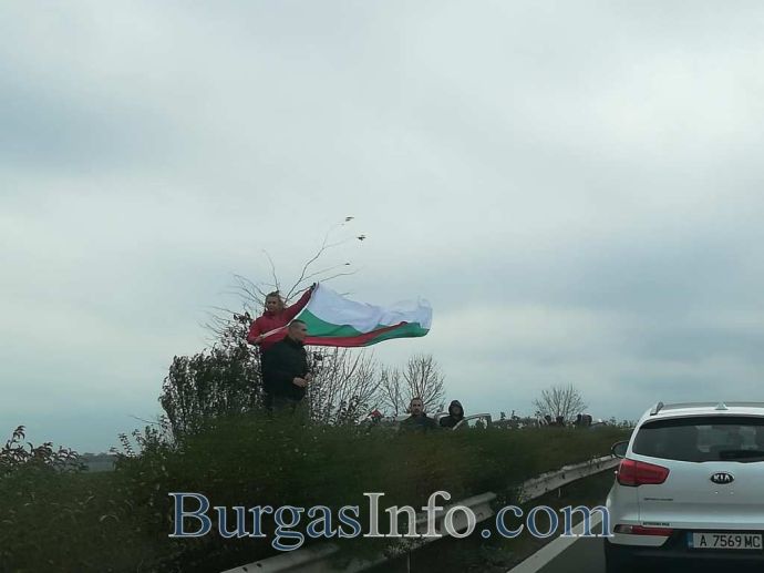 Стотици хора с развети знамена излязоха от колите си и застнаха на пътя от Бургас към АМ „Тракия”. Движението е спряно и в двете посоки.