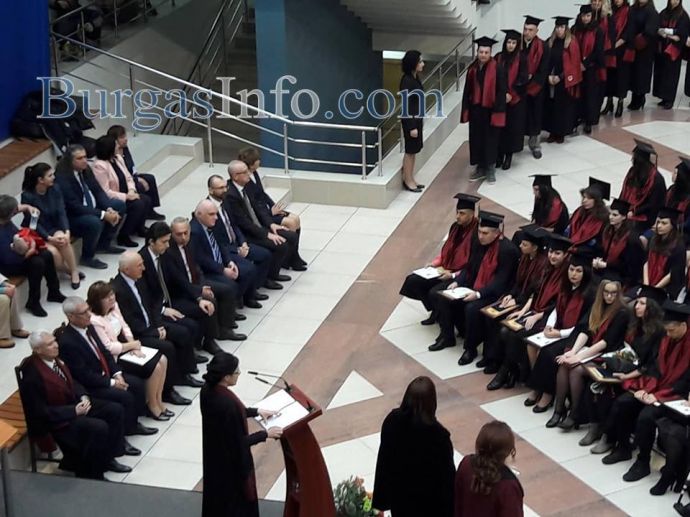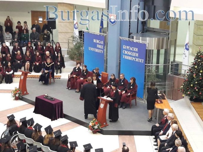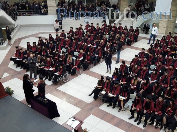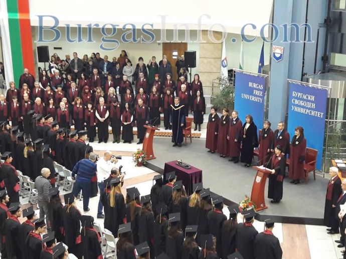 Над 300 абсолвенти получшиха своите дипломи за завършено висше образование, за да поемат по пътя на своята реализация. Тържествената церемония за връчване на дипломите на Випуск 2018 на Бургаския свободен университет се състоя днес в атриума на учебното заведение, ден преди празника на града - Никулден. Отличниците бяха удостоени със свидетелство за отличие за постигнати високи резултати в обучението и доказан стремеж към издигане авторитета на академичната общност.