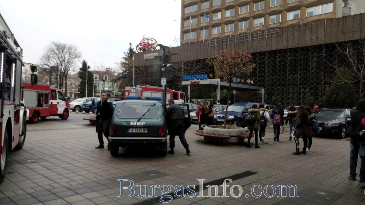 Три пожарни пристигнаха преди минути пред хотел „България“ в центъра на Бургас. От входа на хотела се виждаше дим, казаха очевидци пред БургасИНФО. При ремонта на хотела се е подпалило помещение, в което са били съхранявани столове. Пожарът е овладян, няма опасност от разрастването му.