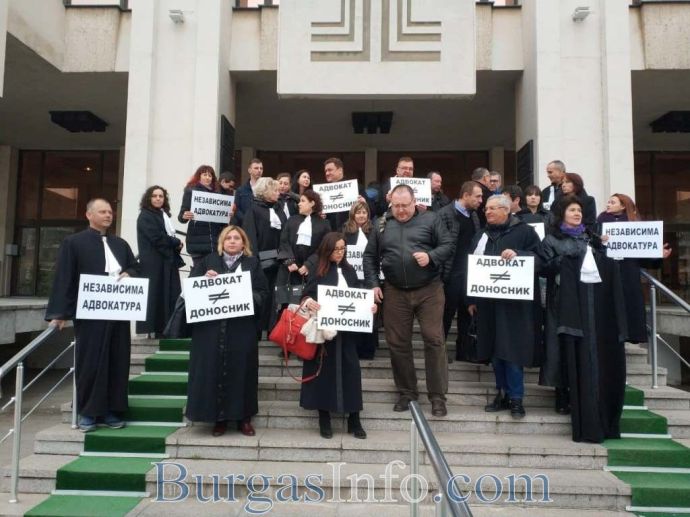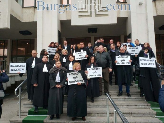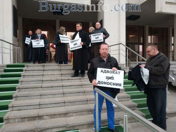 Новият Закон за мерките срещу изпирането на пари вдигна десетки адвокати от Бургаска адвокатска колеги на протест пред съда. В тоги и с издигнати плакати, те призоваха за промяна в закона, така че да не се изисква от тях да стават доносници за своите клиенти.