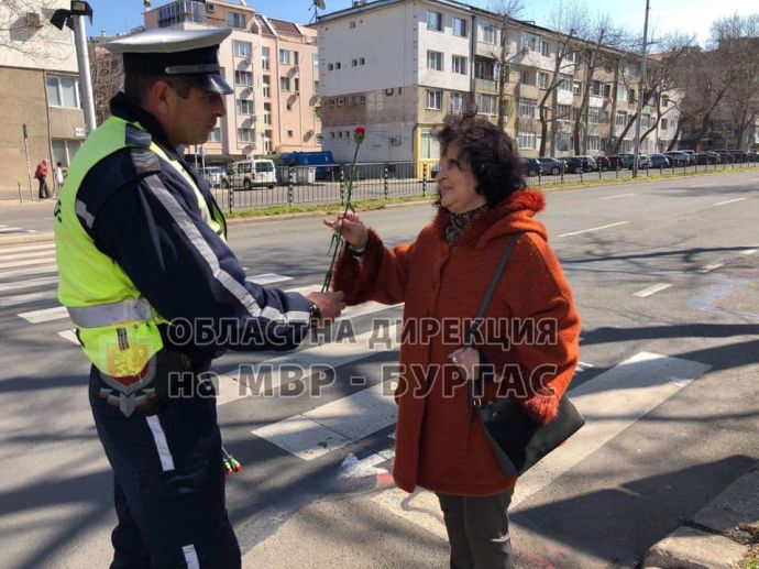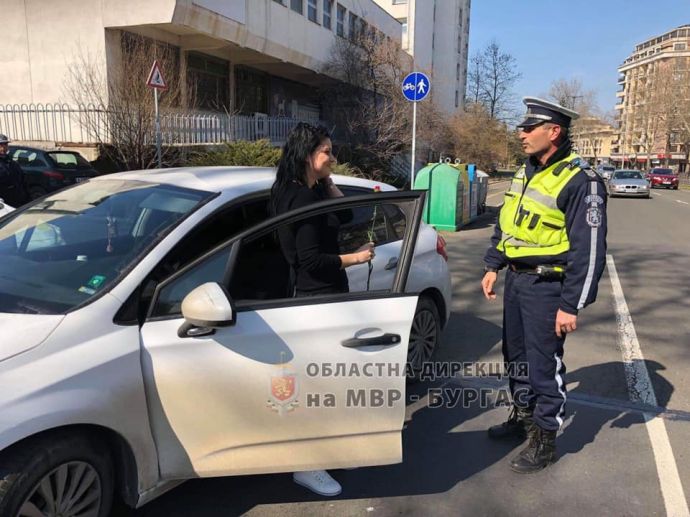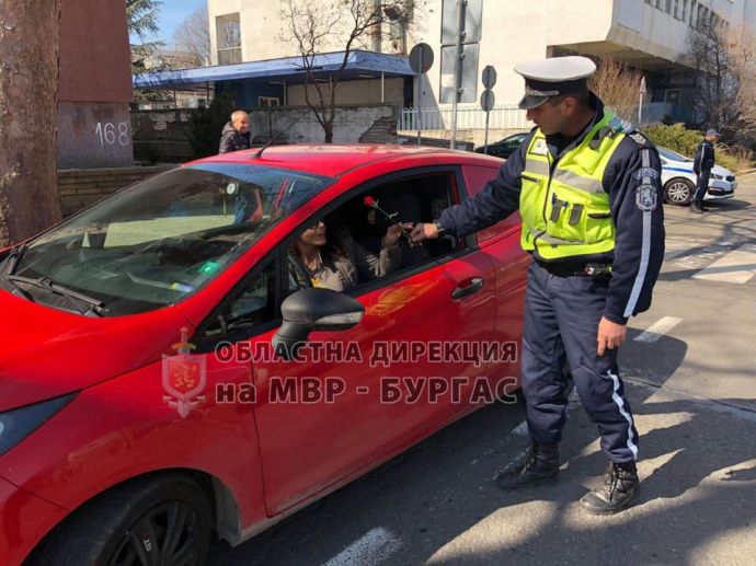 Полицаите в Бургас днес провеждат спец акция, насочена към нежната част от бургазлии – дамите, навръх празника им 8-ми март. Целта на специализираната операция е да предизвикат ведрото настроение и усмивката на жените зад волана. Служители от сектор „Пътна полиция“, съвместно с ОДМВР-Бургас, спират автомобили в района зад хотел „Космос“ на бул. „Демокрация“, управлявани от дами. Вместо строга проверка и актове обаче, те получават с кавалерски жест цвете и усмивка от униформените.