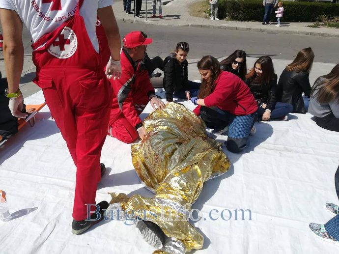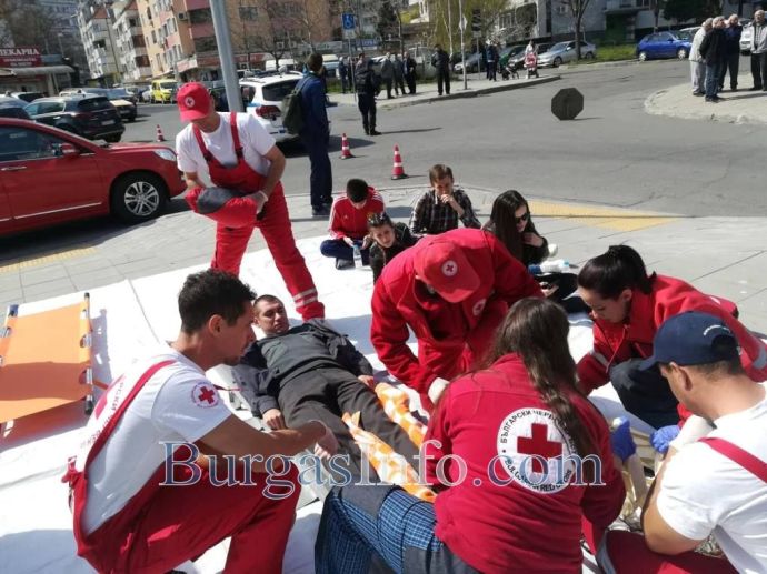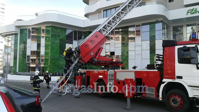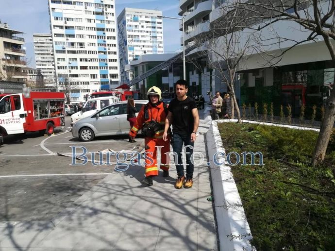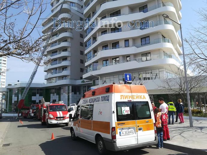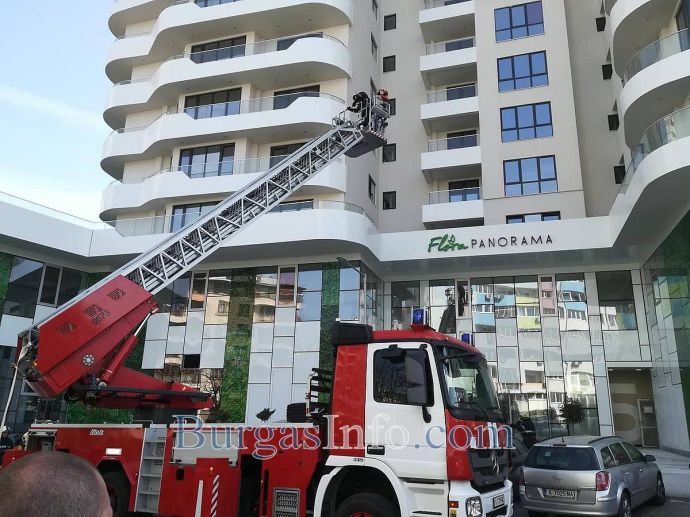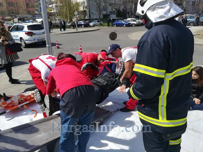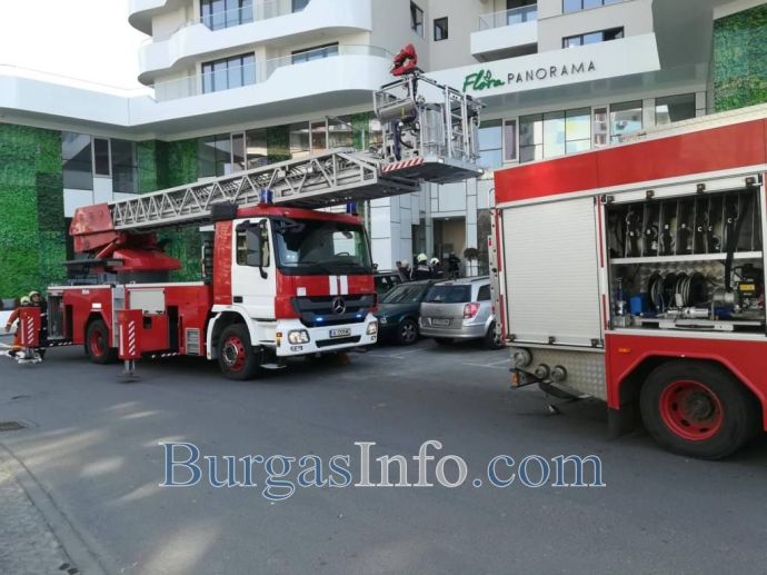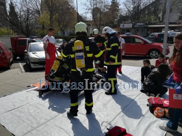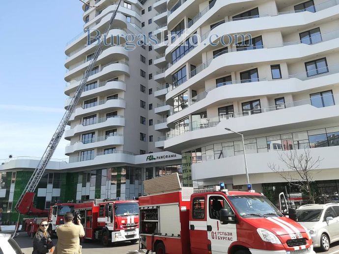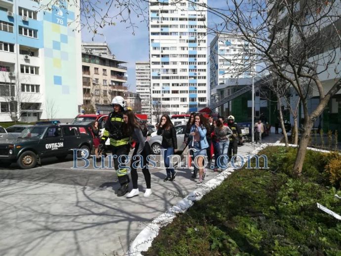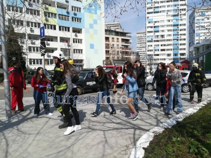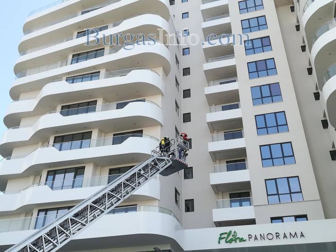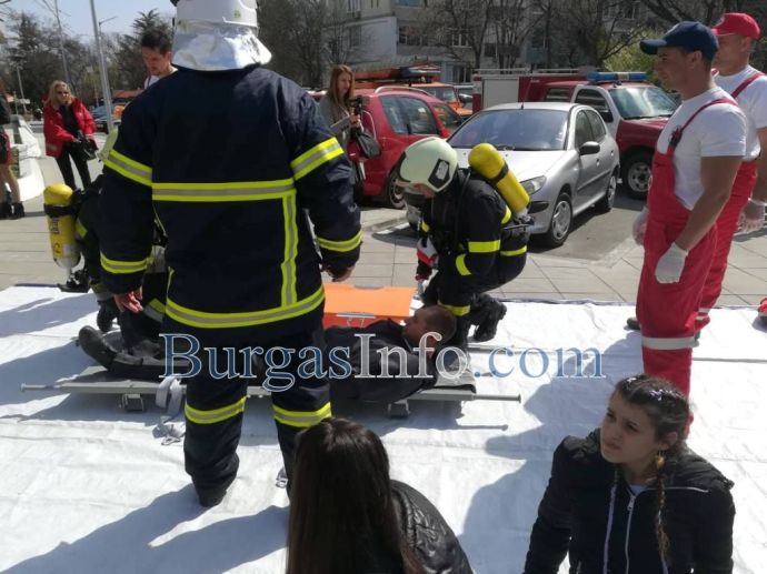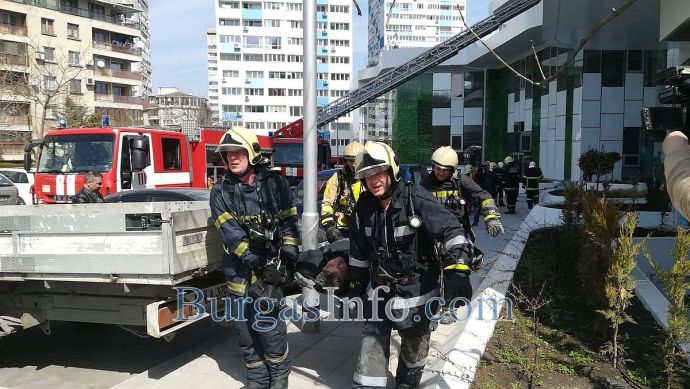 Четири пожарни оградиха за минути новия блок 166 в бургаския ж.к. „Лазур”, срещу Флората. В момента огнеборците провеждат мащабно учение и демонстрират как се спасяват хора от високите етажи, с помощта на 42-метрова стълба. В него взимат участие всички екипи на огнеборците, като водеща роля има Първа противопожарна служба. Пожарникарите пристигнаха буквално за минути от подаването на сигнала и в момента свалят хора от сградата. По сценарий те демонстрират как се реагира с изваждането на пострадали, като действието е толкова реалистично, че се разиграват затрудняващи максимално пожарникарите ситуации. Спасителните операции се развиват основно на три етажа, като най-високият е 13-тият. Разиграната симулация бе с възможно най-висока трудност, като в сценария бе включено и изнасяне и спасяване на ранен колега пожарникар.