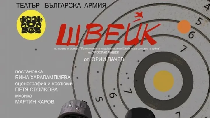 Швейк, Йозеф Швейк от Винохради, идиот по документи, с пъстри очи и дупка на гащите. Швейк, който търгува с кучета, поръчва винаги по три бири, имена помни само на кръчми и за него събития като войни и масови фалити на банки бледнеят пред проблема, колко бира остава недопита при обществени колизии... Обвинен в държавна измяна, вместо в съда, Швейк е изпратен в лудницата, тъй като психиатърът му поставя диагноза „духовна тъпота и вроден кретенизъм”. Там открива мечтания живот – „свобода, братство, порцион и електрификация”, но не задълго, тъй като скоростно го изпращат в затвора, а от там на фронта. Всеотдаен свързочник, Швейк страстно се отдава на свръзки с врага - по конкретно с жените на врага, при това съвсем „плътно” и „прилепнало”. „Отлепен” от една такава вражеска госпожа, бива пленен от руснаците. Как и защо се озовава издокаран с нова руска униформа, не става съвсем ясно. Два часа по-късно е отново пленен, този път от своите – заради руския шинел! Висшият чешки военен го осъжда на екзекуция по бързата процедура. Но … нещо се обърква за пореден път! И ...„Знаете ли откъде започва упадъкът на една държава? Когато, поради изобилие от идиоти, спрат да ценят истинските”. А Швейк е истински идиот!...Звучи познато? Почти до сълзи! Но…бихте могли да се посмеете над това и да се позабавлявате също. Всъщност, ако се позамислите, ще разберете, че единственото оръжие срещу ширещия се и войнстващ „кретенизъм” и тогава, и сега е смехът. Очистващият и осмеляващ смях. Съвременният „Швейк” вече Ви чака с Театър „БЪЛГАРСКА АРМИЯ”. И понеже всички сме на един дъх разстояние от масово видиотяване, моля не отлагайте срещата с „ШВЕЙК”. Герасим Георгиев – Геро, Валентин Танев, режисьорът Бина Харалампиева, драматургът Юрий Дачев, сценографът Петя Стойкова и композиторът Мартин Каров са подготвили експлозия от смях, достатъчно мощна, за да Ви очисти от тревогите, депресиите и сериозността за дълго време. Чувствайте се поканени и заповядайте, но не се бавете прекомерно.