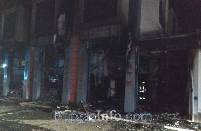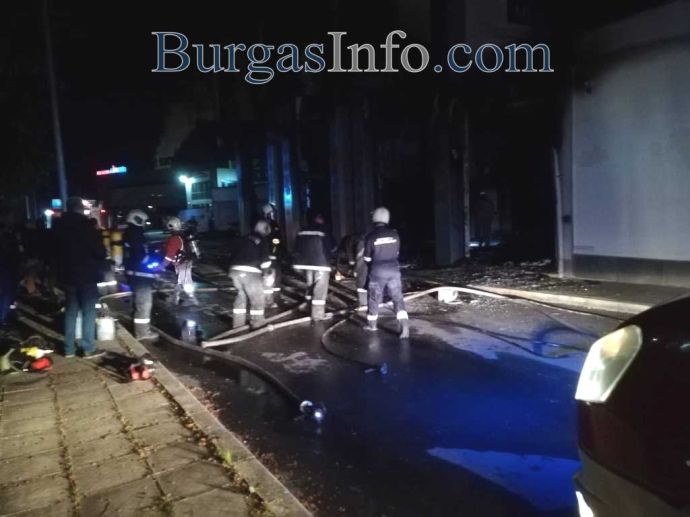 На място са три противопожарни автомобила, а магазинът е изгорял напълно.