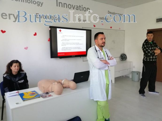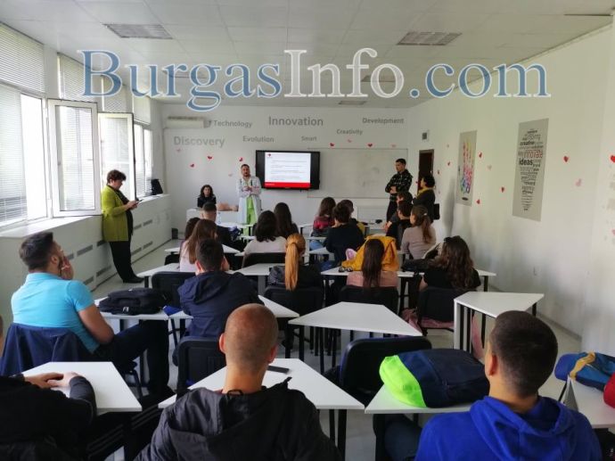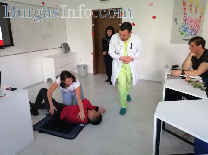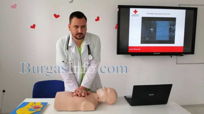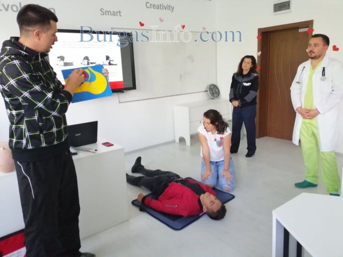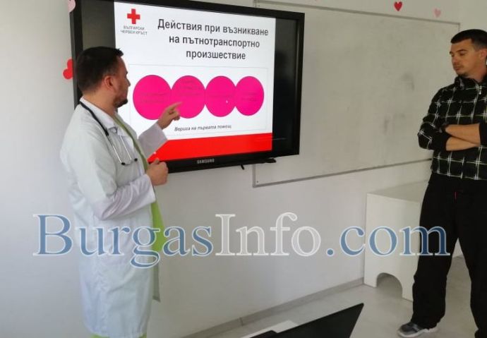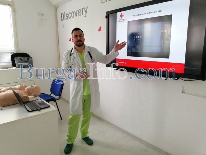 Над 30 абитуриенти от Търговската гимназия в Бургас днес получиха ценни съвети как да се пазят и да оказват първа помощ на пътя в случай на инцидент. Инициативата за срещата с младите хора беше на специализанта по неврохирургия от УМБАЛ-Бургас д-р Светослав Тодоров, като на нея присъства и Галя Стоянова – инспектор „Пътна полиция“ към ОДМВР-Бургас. В полезните демонстрации се включи и учителят по физическо възпитание и доброволец към БЧК Станимир Коларов. В тях участваха и самите зрелостници.