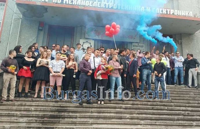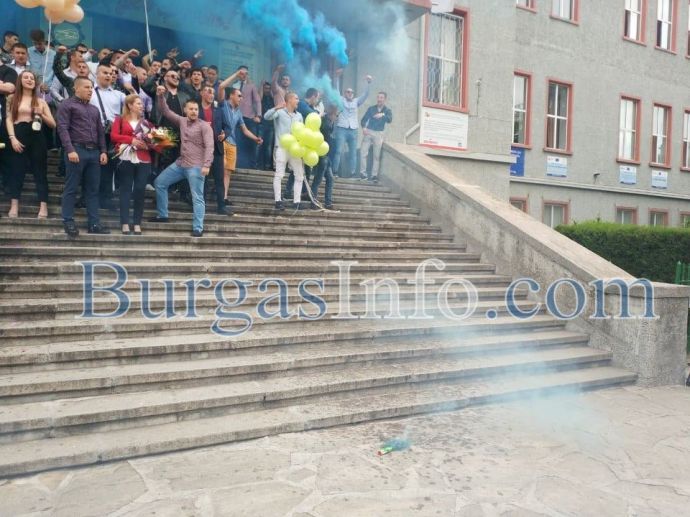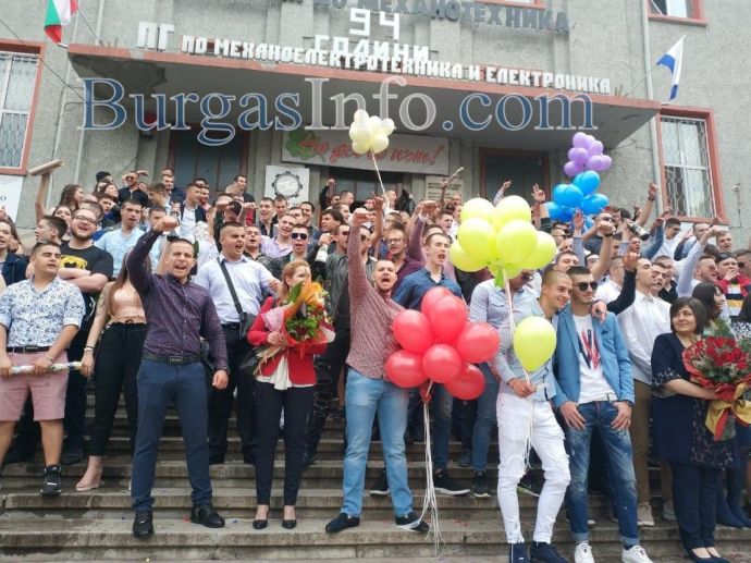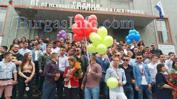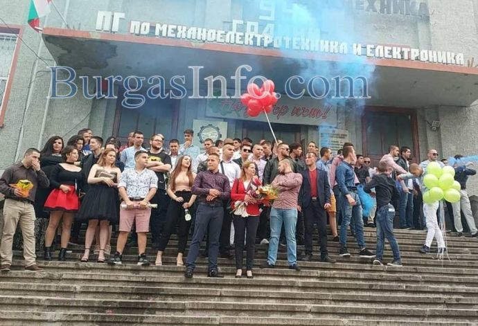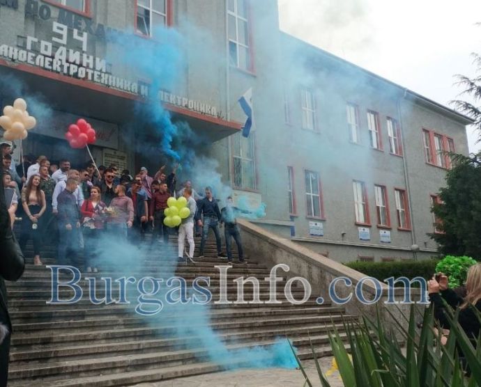 Същински екшън разиграха абитуриентите от Професионалната гимназия по механоелекктротехника и електроника в Бургас, известна като Механото. Изпращането им се състоя на стълбите пред гимназията, която се намира на възловия бул. „Стефан Стамболов“. Сини димки, хвърлени на плочките и в градинките оцветяваха скандиранията „1,2,3...12“. Димната завеса скри за кратко церемонията. В съчетание се чуваше и трошене на бутилки шампанско, които след като бяха отворяни и изпивани, политаха встрани от стълбите, във всевъзможни посоки. Бурните емоции на младежите бяха съпроводени и от мощни свирки като на футболни рефери и викове „Само Левски“.