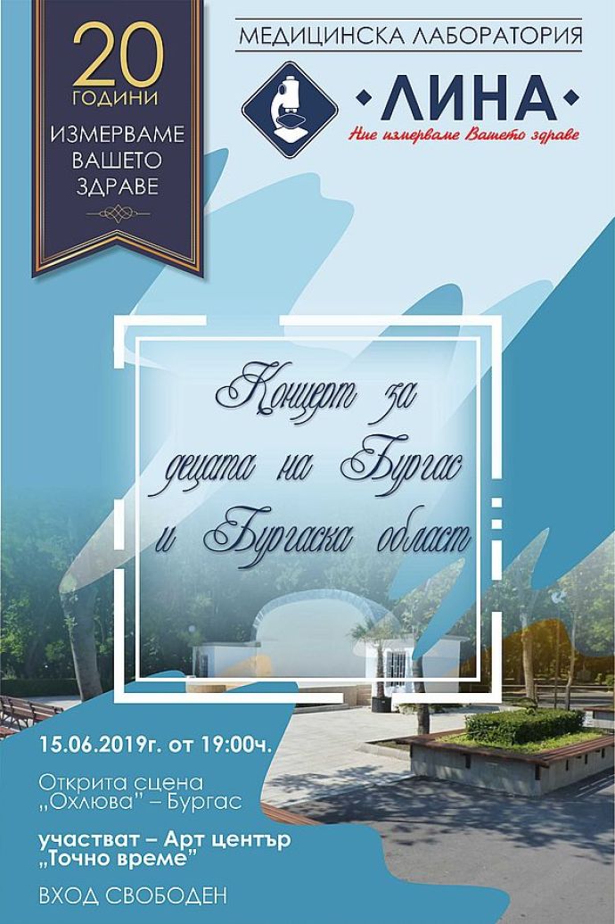 Инициативите за 20-та годишнина на Медицинска лаборатория „ЛИНА” продължават с две събития за всички малчугани. Тази вечер (събота) от 19:00ч. на Открита сцена „Охлюва” – Бургас концерт ще изнесат малките певци от Арт център „Точно време” с ръководител вокалния педагог Жени Лалчева. Водещ на концерта ще е известният бургазлия Стефан Лалчев.