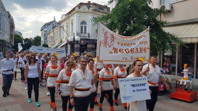 Повече от 30 състава от всички краища на страната вчера изпъстриха пл. "Св. Св. Кирил и Методий" в Поморие. По традиция те дефилираха по центъра на града, представяйки киприте си стилизирани съвременни или класически народни носии. Начало на юбилейното издание даде заместник-кметът Янчо Илиев. Той приветства всички присъстващи и изчете поздравителен адрес от името на кмета Иван Алексиев. "Гордост е, че клуб "Чайка" представлява града ни в страната и чужбина. Възхитителен е обаче и фактът, че вече толкова години една чайка успява да привлече на поморийския бряг стотици участници от цяла България и да ги приюти под крилото си. Чайката е един от символите на Поморие, но вие сте част от културната му емблема.", казва в поздравителния си адрес кметът Алексиев.
