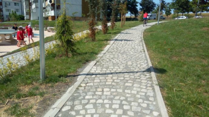 В междублоковото пространство са изградени две детски площадки, предназначени за възрастови групи от 0 до 3 и от 3 до 12 години, кътове за отдих, тенис маса и игрище за бадминтон. Второстепенни алеи осигуряват бърз достъп от входовете на блоковете до главната алея. Реновирани са стълбите през жилищните блокове, зелените площи са оформени по стандартите за балансирана градска среда. Поставени са нови пейки, кошчета за отпадъци, енергоефективно парково осветление. Създадени са условия за достъп на хора в неравностойно положение, внедрени са иновативни решения за оползотворяване на дъждовната вода.