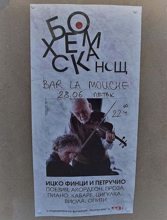 Бохемска нощ очаква всички посетители на бар La Mouche до къмпинг „Златна рибка” този петък (28-ми юни). Големият актьор и цигулар Ицко Финци и джаз рок пианистът Петко Мюфтиев – Петручио ще зарадват публиката с поезия, изпълнения на акордеон, редувани с проза, пиано, цигулка, виола и музикални кабаре акценти. Всичко това ще се случи на самия плаж до къмпинг „Златна рибка” в невероятния бар La Mouche. Мястото омагьосва всеки, стъпил в него, с невероятната си атмосфера и чар.