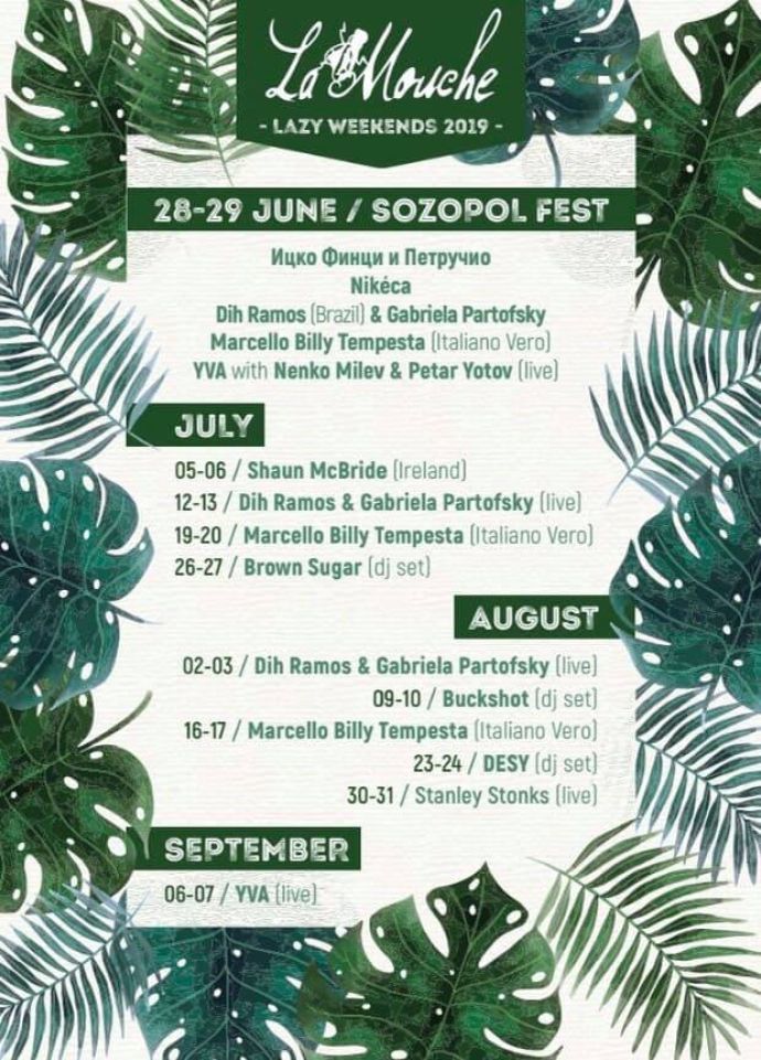 Бар La Mouche са се погрижили да осигурят вълнуващи уикенди на своите посетители. В събота, 29-ти юни за музикалната атмосфера ще се погрижат: Dih Ramos (Brazil) &Gabriela Partofsky ,Marcello Billy Tempesta (Italiano Vero) , YVA (Iva Jankulova).